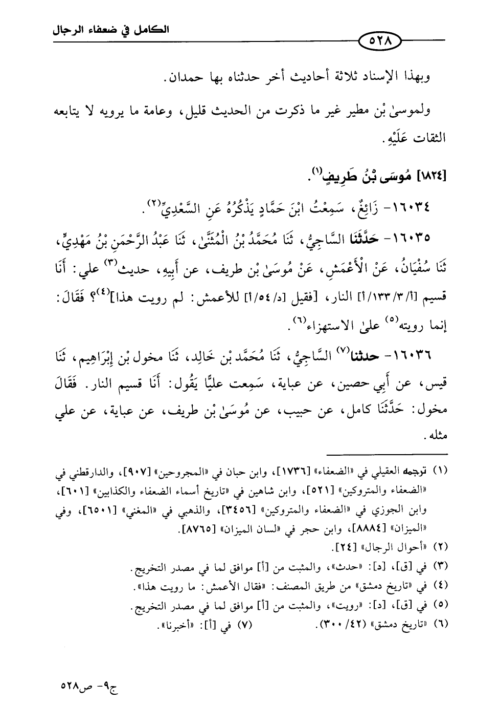 16035 - حَدثنا الساجي، حَدثنا مُحمد بن المثنى، حَدثنا عَبد الرحمن بن مهدي، حَدثنا سُفيان، عن الأَعمَش، عن موسى بن طريف، عن أبيه، حديث علي: أنا قسيم النار. فقيل للأعمش: لم رويت هذا؟ فقال: إنما رويته على الاستهزاء.