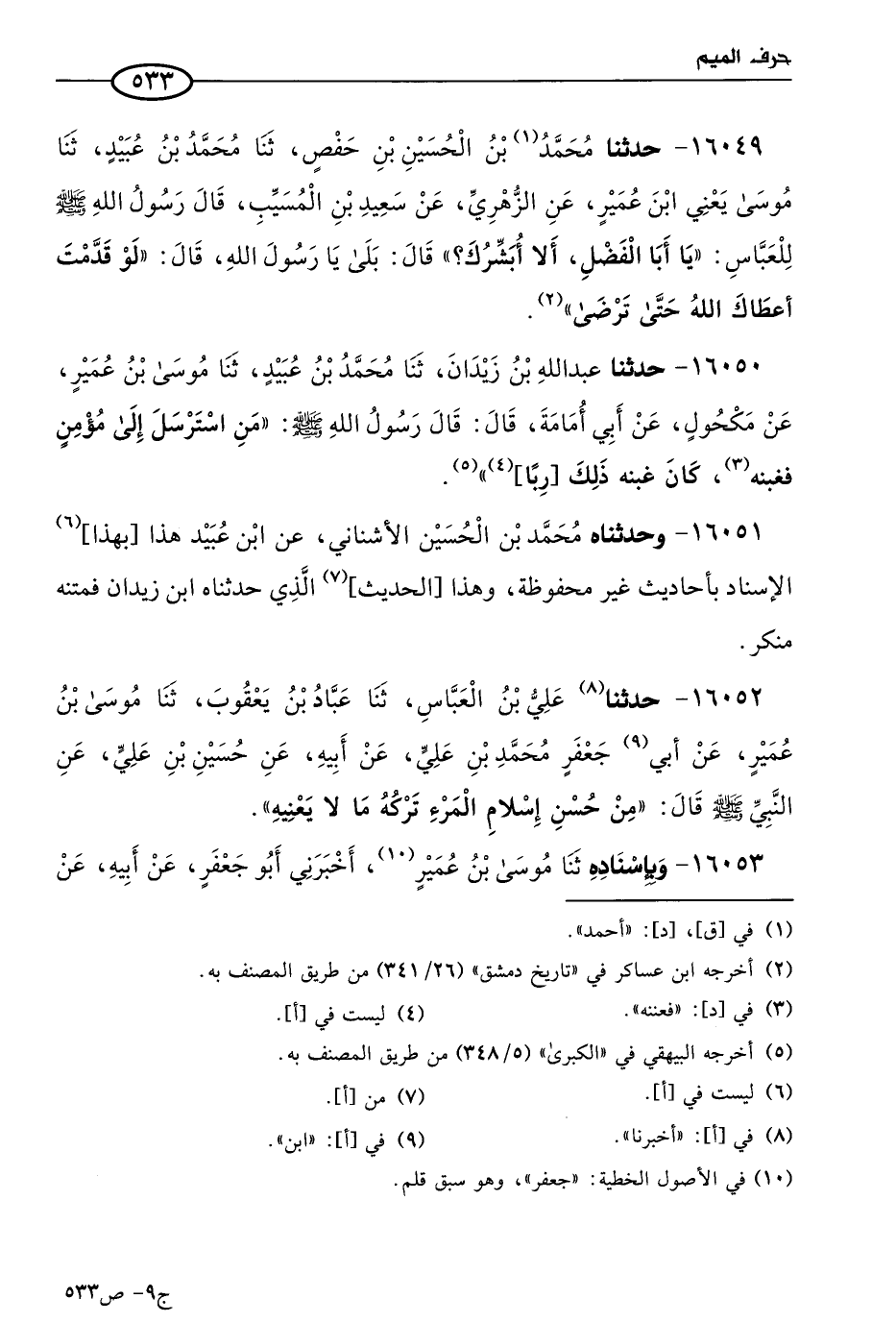 16052 - حدثنا علي بن العباس، حَدثنا عباد بن يعقوب، حَدثنا موسى بن عُمَير، عن أبي جعفر مُحمد بن علي، عن أبيه، عن حسين بن علي، عن النبي صَلى الله عَليه وسَلم قال: من حسن إسلام المرء تركه ما لا يعنيه.