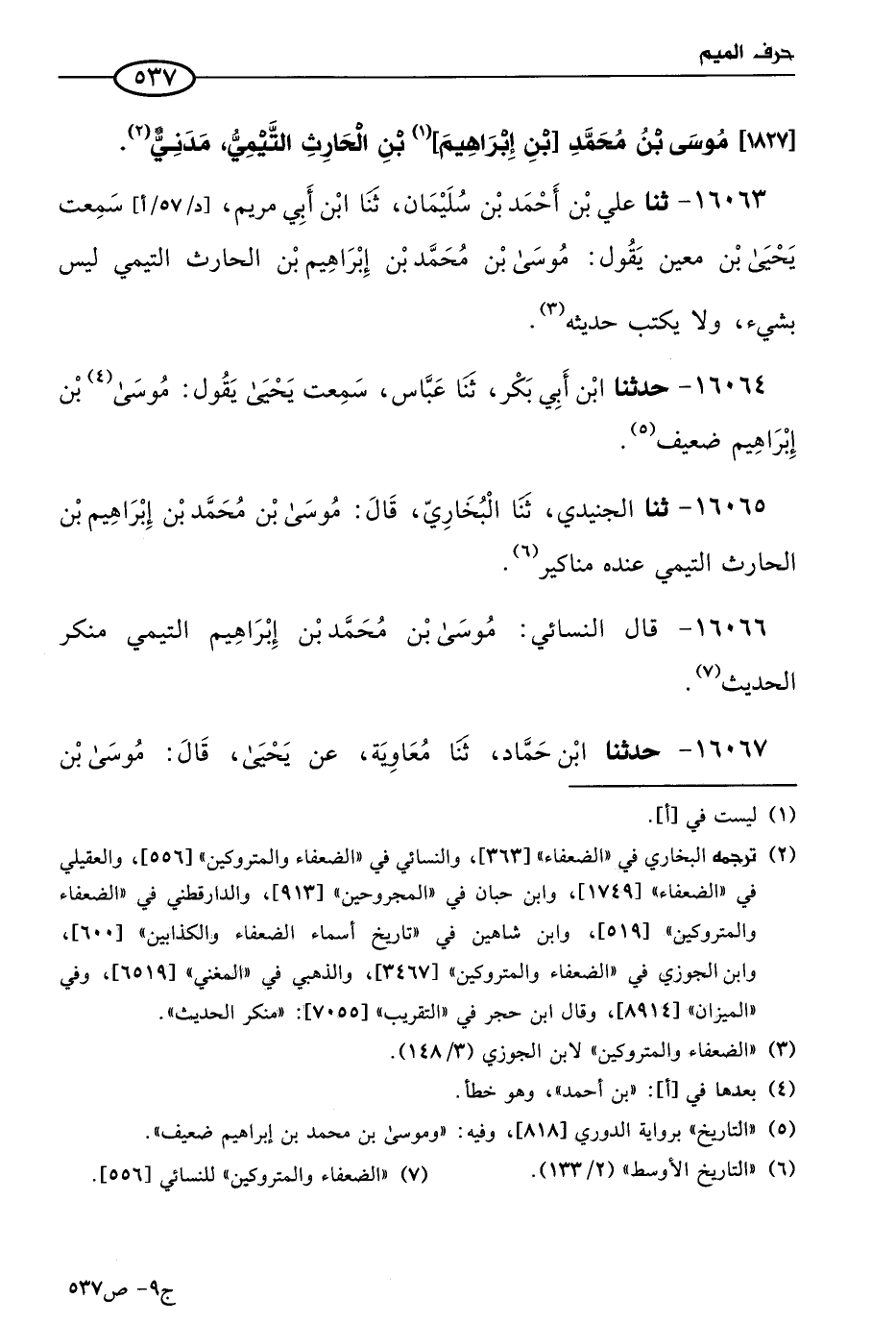 16063 - حَدثنا علي بن أحمد بن سليمان، حَدثنا ابن أبي مريم، سمعت يَحيى بن مَعين، يقول: موسى بن مُحمد بن إبراهيم بن الحارث التيمي ليس بشَيءٍ، ولا يكتب حديثه.