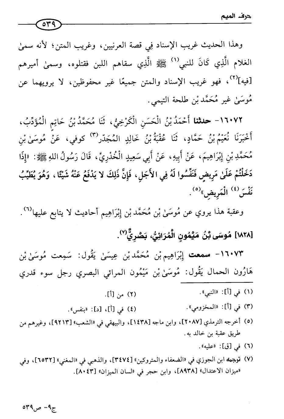 16072 - حَدثنا أحمد بن الحسن الكرخي، قال: حَدثنا مُحمد بن حاتم المؤدب، أخبرنا نعيم بن حماد، حَدثنا عقبة بن خالد المجدر كوفي، عن موسى بن مُحمد بن إبراهيم، عن أبيه، عن أبي سعيد الخدري، قال رسول الله صَلى الله عَليه وسلم: إذا دخلتم على مريض فنفسوا له في الأجل، فإن ذلك لا يدفع عنه شيئا، وهو يطيب نفس المريض.