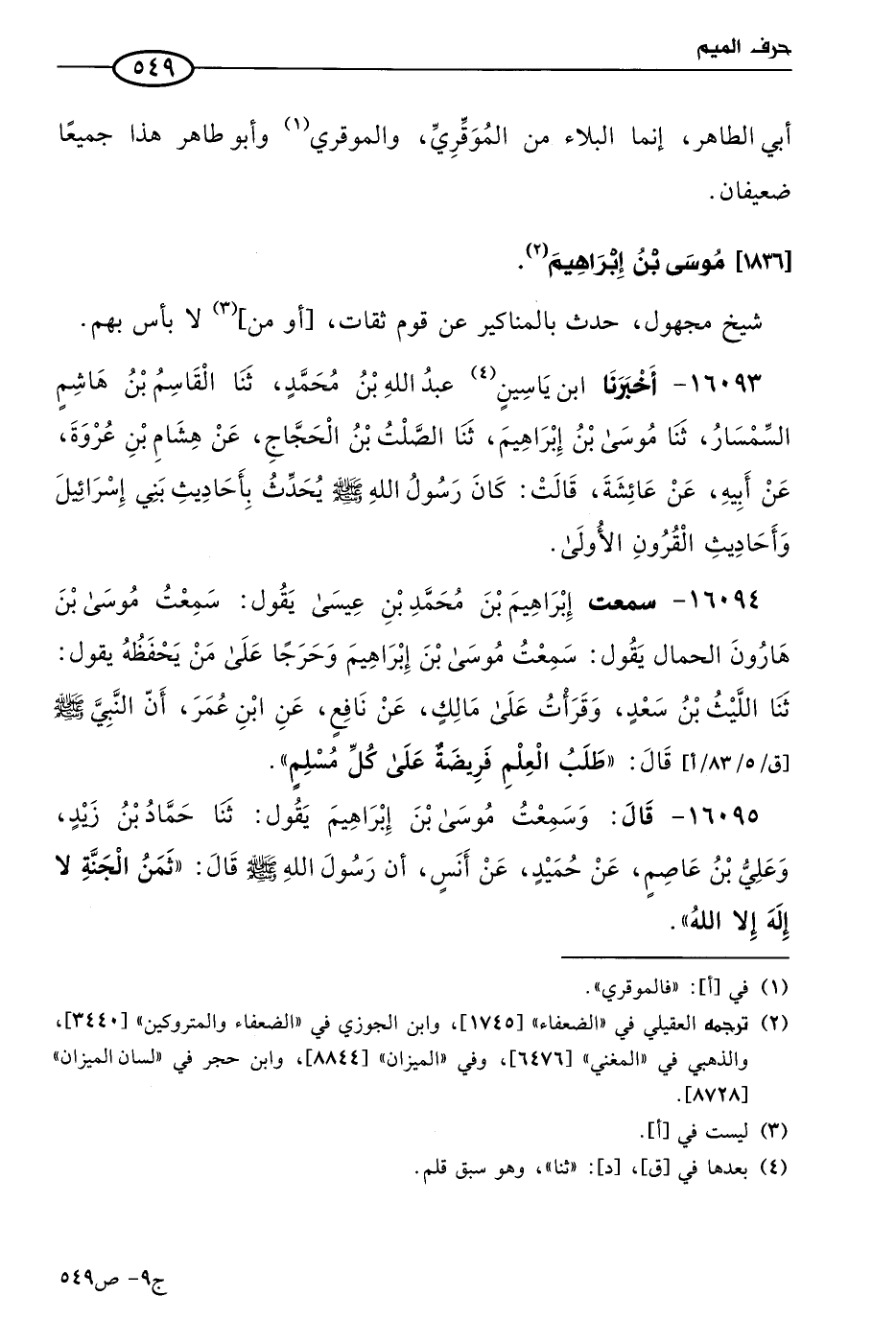 16094 - سمعت إبراهيم بن مُحمد بن عيسى، يقول: سَمعتُ موسى بن هارون الحمال، يقول: سَمعتُ موسى بن إبراهيم، وخرجا على من يحفظه، بقول: حَدثنا الليث بن سعد، وقرأت على مالك عن نافع، عن ابن عُمر؛ أَن النَّبي صَلى الله عَليه وسَلم قال: طلب العلم فريضة على كل مسلم (1).