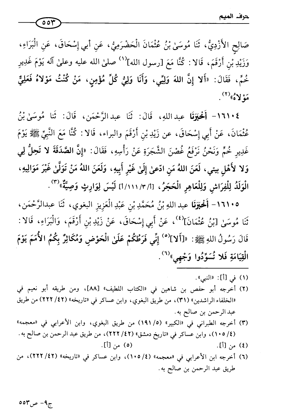 16104 - أخبرنا عَبد الله، قال: حَدثنا عَبد الرحمن، قال: حَدثنا موسى بن عثمان بن الحضرمي، عن أبي إسحاق، عن زيد بن أرقم، والبراء، قالا: كنا مع النبي صَلى الله عَليه وسلم يوم غدير خم، ونحن نرفع غصن الشجرة عن رأسه، فقال: إن الصدقة لا تحل لي، ولا لأهل بيتي، لعن الله من ادعى إلى غير أبيه، ولعن الله من تولى غير مواليه، الولد للفراش، وللعاهر الحجر، ليس لوارث وصية.