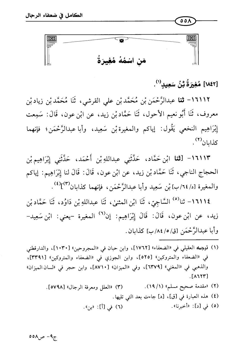 16114 - حَدثنا الساجي، حَدثنا ابن المثنى، قال: حَدثنا عَبد الله بن داود، حَدثنا حماد بن زيد، عن ابن عون، قال: قال إبراهيم: إن المغيرة، يَعني ابن سعيد، وأبا عَبد الرحمن كذابان.