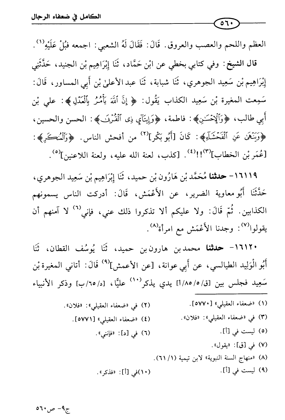 قال الشيخ: وفي كتابي بخطي عن ابن حماد، حَدثنا إبراهيم بن الجنيدي، حَدَّثني إبراهيم بن سعيد الجوهري، حَدثنا شبابة، حَدثنا عَبد الأعلى بن أبي المساور، قال: سمعتُ المغيرة بن سعيد الكذاب يقول: {إن الله يأمر بالعدل}، علي بن أبي طالب، و {الإحسان}، فاطمة، {وإيتاء ذي القربي}، الحسن والحُسَين، {وينهى عن الفحشاء}، كان أَبو بكر من أفحش الناس، {والمنكر}، عُمر بن الخطاب. كذب لعنه الله عليه ولعنة اللاعنين.