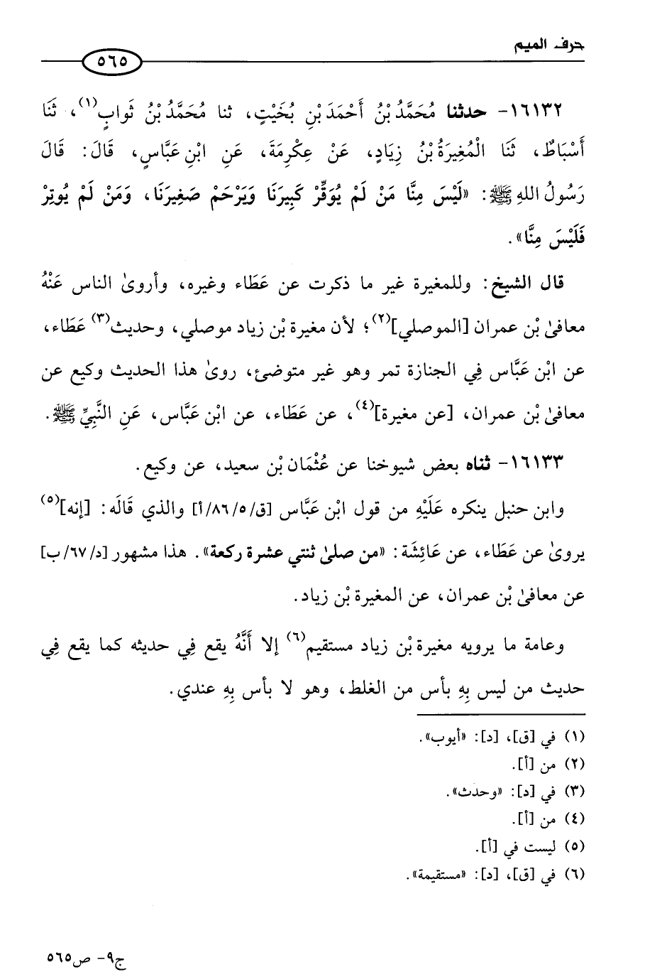 16133 - حَدثناهُ بعض شيوخنا عن عثمان بن سعد، عن وكيع، وابن حنبل ينكره عليه من قول ابن عباس، والذي قال إنه يروى عن عَطاء، عن عائشة: من صلى اثنتي عشرة ركعة. هذا مشهور عن معافى بن عمران، عن المغيرة بن زياد، وعامة ما يرويه مغيرة بن زياد مستقيم، إلا أنه يقع في حديثه كما يقع هذا في حديث من ليس به بأس من الغلط، وهو لا بأس به عندي.
