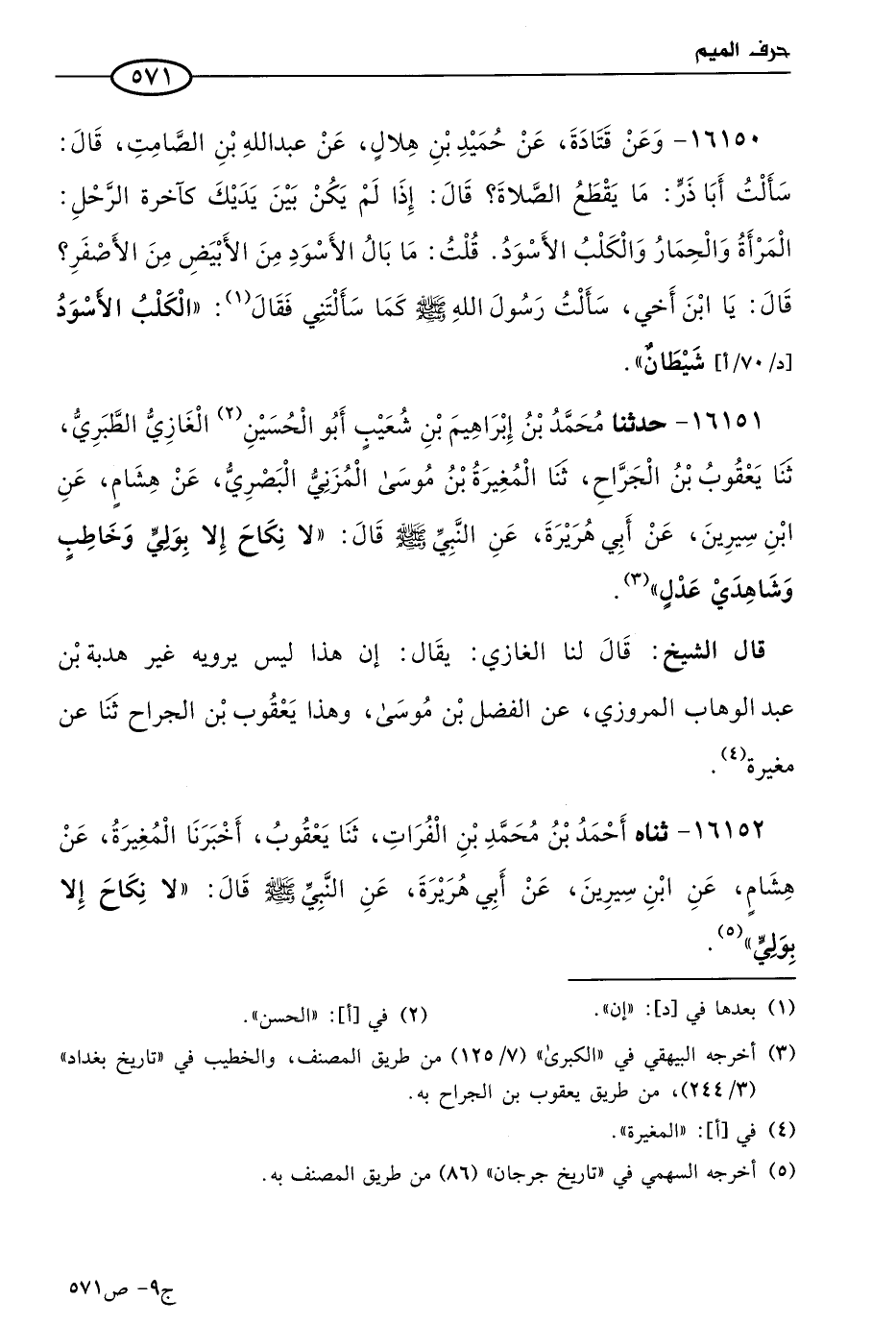 16151 - حَدثنا مُحمد بن إبراهيم بن شُعَيب أَبو الحسين الغازي الطبري، حَدثنا يعقوب بن الجراح، حَدثنا المغيرة بن موسى المزني البصري، عن هشام، عن ابن سِيرين، عن أبي هريرة، عن النبي صَلى الله عَليه وسَلم قال: لا نكاح إلا بولي، وخاطب، وشاهدي عدل.
