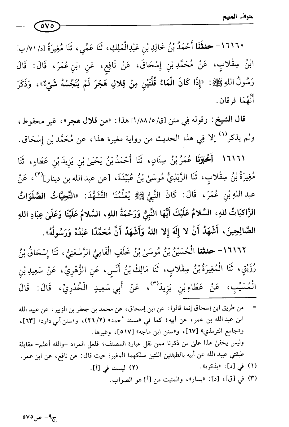 16160 - حَدثنا أحمد بن خالد بن عَبد الملك، حَدثنا عمي، حَدثنا مغيرة بن سقلاب، عن مُحمد بن إسحاق، عن نافع، عن ابن عُمر، قال: قال رسول الله صَلى الله عَليه وسَلم: إذا كان الماء قلتين من قلال هجر لم ينجسه شيء. وذكر أنهما من فرقان.