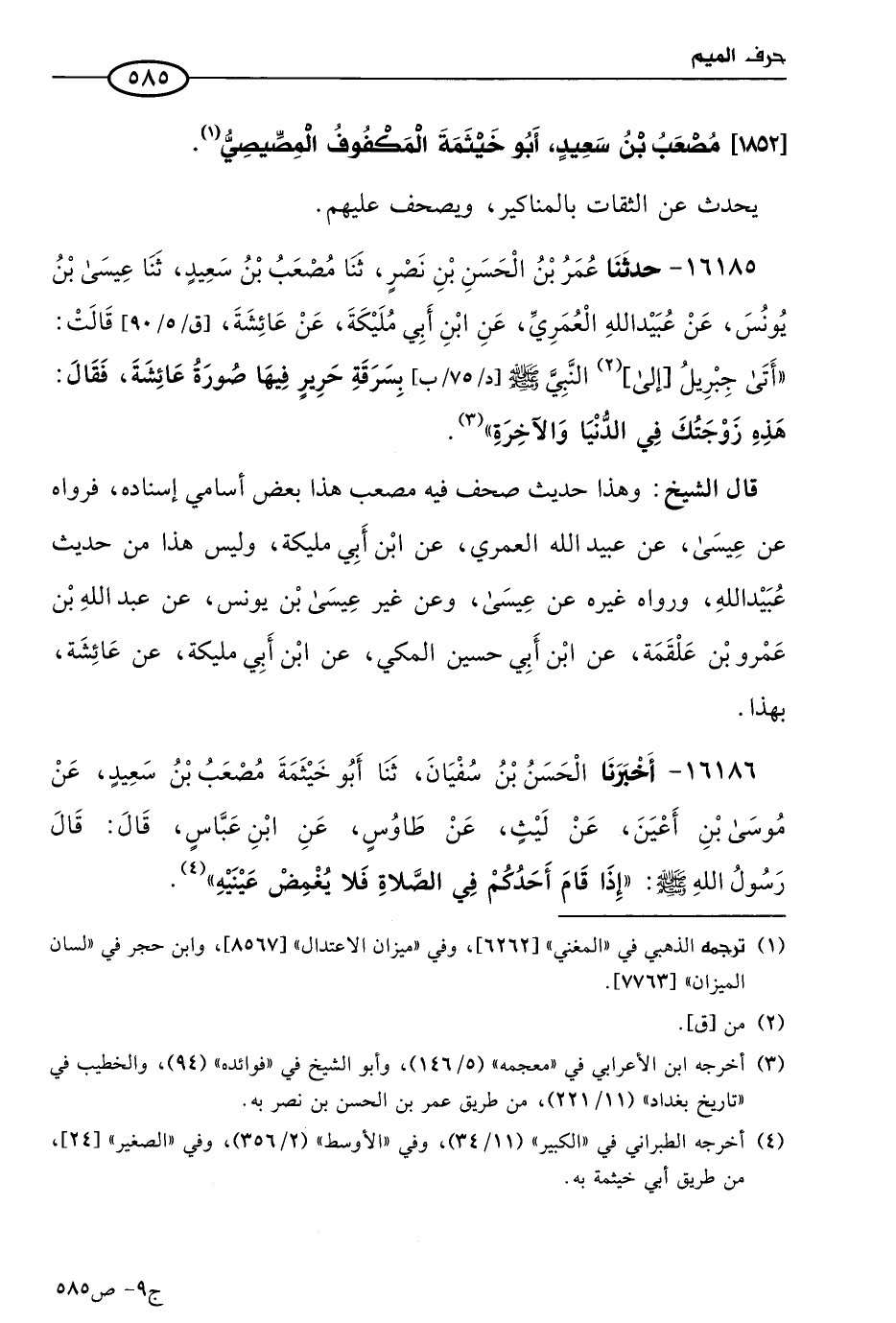 قال الشيخ: وهذا حديث صحف فيه مصعب هذا بعض أسامي إسناده، فرواه عن عيسى، عن عُبيد الله العُمري، عن ابن أبي مليكة، وليس هذا من حديث عُبيد الله، ورواه غيره عن عيسى، وعن غير عيسى بن يُونُس، عن عَبد الله بن عَمرو بن علقمة، عن ابن أبي حسين المَكِّي، عن ابن أبي مليكة، عن عائشة بهذا.