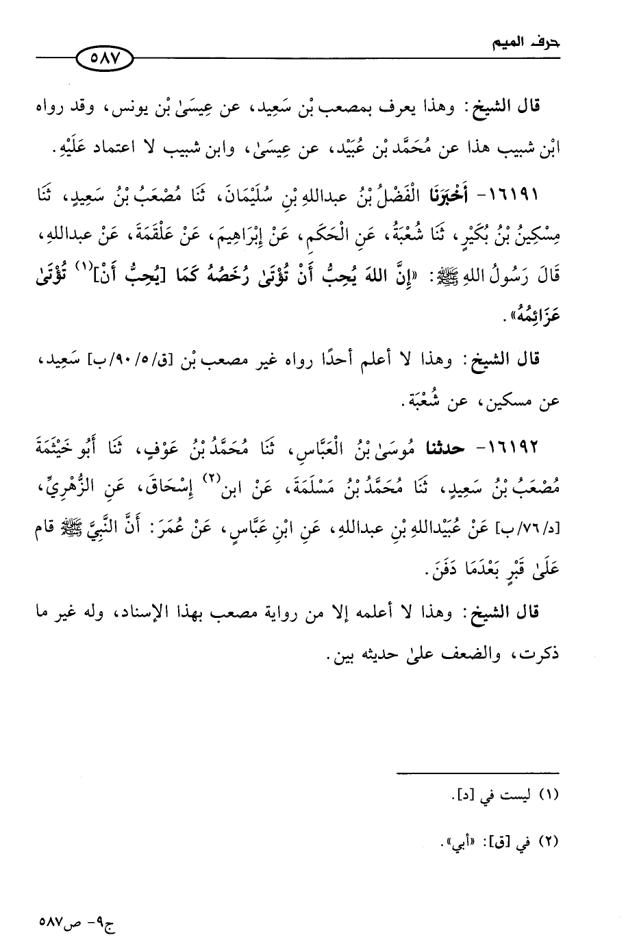 16191 - أخبرنا الفضل بن عَبد الله بن سليمان، حَدثنا مصعب بن سعيد، حَدثنا مسكين بن بُكَير، حَدثنا شُعبَة، عن الحكم، عن إبراهيم، عن علقمة، عن عَبد الله، قال رسول الله صَلى الله عَليه وسَلم: إن الله يحب أن تؤتى رخصه، كما يحب أن تؤتى عزائمه.
