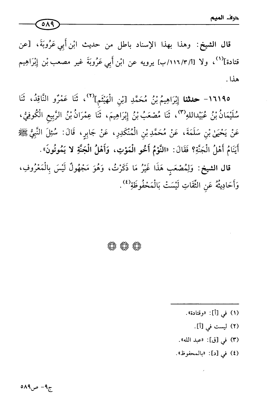16195 - حَدثنا إبراهيم بن مُحمد بن الهيثم، حَدثنا عَمرو الناقد، حَدثنا سليمان بن عُبيد الله، حَدثنا مصعب بن إبراهيم، حَدثنا عمران بن الربيع الكوفي، عن يَحيى بن سلمة، عن مُحمد بن المنكدر، عن جابر، قال: سئل النبي صَلى الله عَليه وسلم: أينام أهل الجنة؟ فقال: النوم أخو الموت، وأهل الجنة لا يموتون.