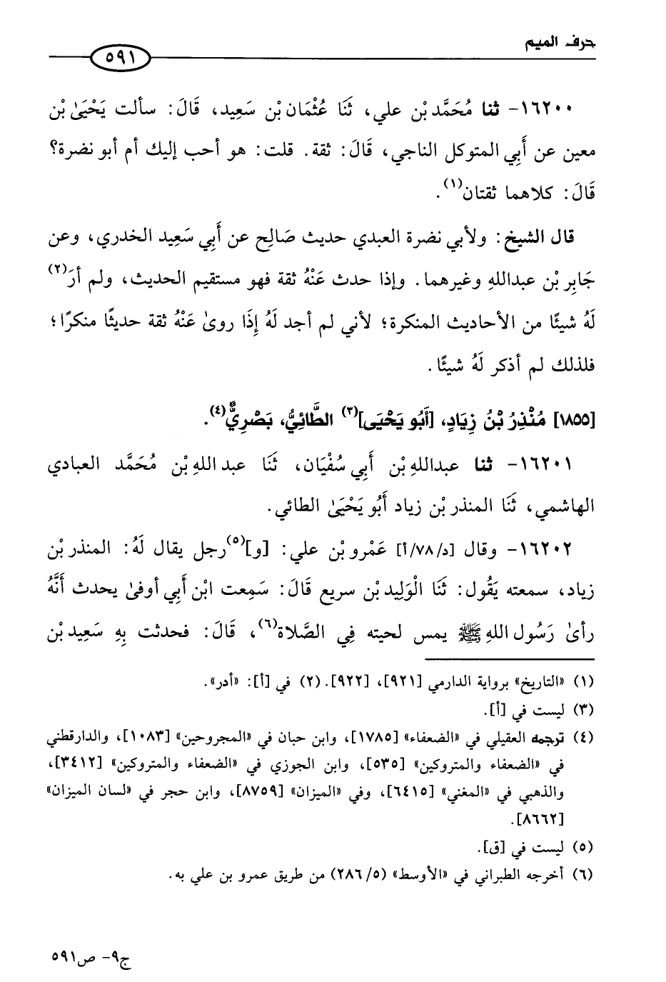 16200 - حَدثنا مُحمد بن علي، حَدثنا عثمان بن سعيد، قال: سَألتُ يَحيى بن مَعين، عن أبي المتوكل الناجي، قال: ثقةٌ، قلت: هو أَحَب إليك، أُمّ أَبو نضرة؟ قال: كلاهما ثقتان.