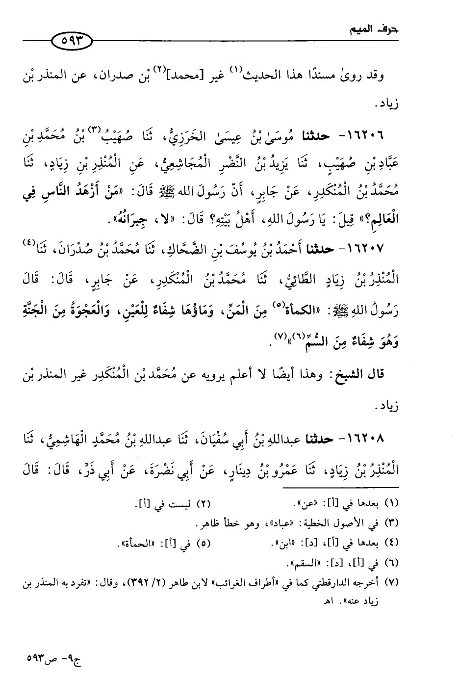 16206 - حَدثنا موسى بن عيسى الخرزي، حَدثنا صهيب بن مُحمد بن عباد بن صهيب، حَدثنا يزيد بن النضر المجاشعي، عن المنذر بن زياد، حَدثنا مُحمد بن المنكدر، عن جابر؛ أن رسول الله صَلى الله عَليه وسَلم قال: من أزهد الناس في العَالِم؟ قيل: يا رسول الله أهل بيته؟ قال: لاَ، جيرانه.