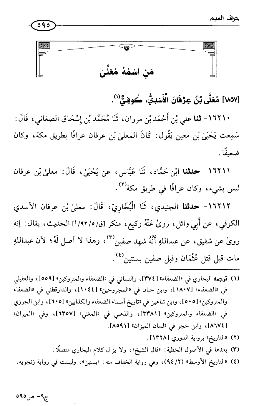16212 - حَدثنا الجنيدي، حَدثنا البُخاري قال: معلى بن عرفان الأسدي الكوفي عن أبي وائل، روى عنه وكيع، منكر الحديث، يقال: إنه روى عن شقيق، عن عَبد الله؛ أنه شهد صفين. وهذا لا أصل له، لأن عَبد الله مات قبل قتل عثمان وقبل صفين بسنتين (1).
