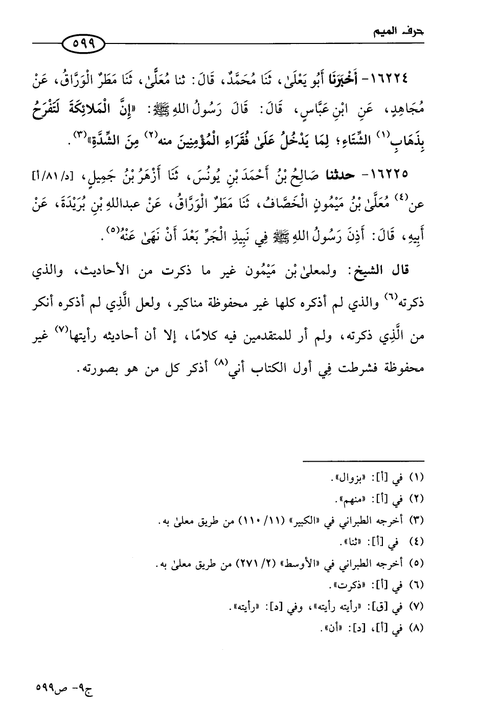 16224 - أخبرنا أَبو يَعلَى، حَدثنا مُحمد، قال: حَدثنا معلى، حَدثنا مطر الوراق، عن مجاهد، عن ابن عباس، قال: قال رسول الله صَلى الله عَليه وسَلم: إِنّ الملائكة لتفرح بذهاب الشتاء، لما يدخل على فقراء المؤمنين منه من الشدة.