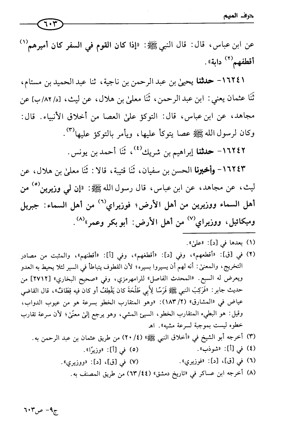 16241 - حَدثنا يَحيى بن عَبد الرحمن بن ناجية، حَدثنا عَبد الحميد بن مستام، حَدثنا عثمان، يَعني ابن عَبد الرحمن، حَدثنا معلى بن هلال، عن لَيث، عن مجاهد، عن ابن عباس قال: التوكؤ على العصا من أخلاق الأنبياء، قال: وكان لرسول الله صَلى الله عَليه وسلم عصا يتوكأ عليها، ويأمر بالتوكؤ عليها.
