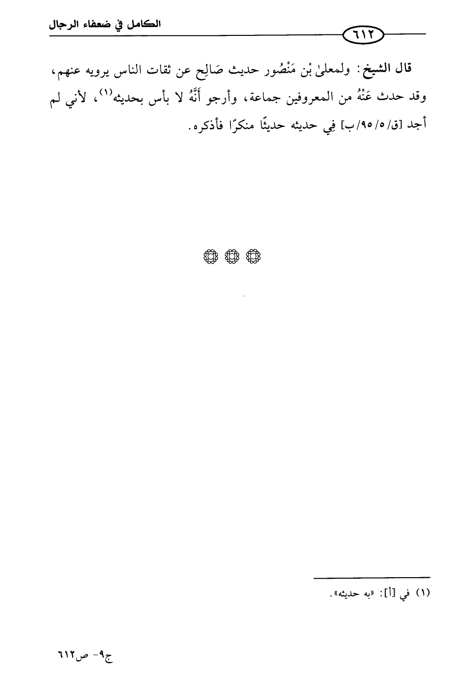 قال الشيخ: ولمعلى بن منصور حديث صالح عن ثقات الناس، يرويه عنهم، وقد حدث عنه من المعروفين جماعة، وأرجو أنه لا بأس بحديثه، لأني لم أجد في حديثه حديثًا منكرا فأذكره.