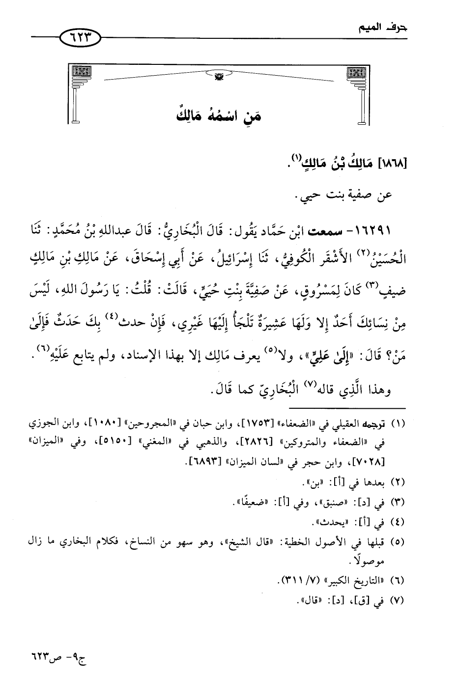 16291 - سمعتُ ابن حماد يقول: قال البُخاري: قال عَبد الله بن مُحمد، حَدثنا الحسين الأشقر الكوفي، حَدثنا إسرائيل، عن أبي إسحاق، عن مالك بن مالك،- ضيفٍ كان لمسروق -، عن صفية بنت حيي، قالت: قلتُ: يا رسول الله، ليس من نسائك أحدٌ إلا ولها عشيرة تلجأ إليها غيري، فإن حدث بك حدث، فإلى مَن؟ قال: إلى علي.