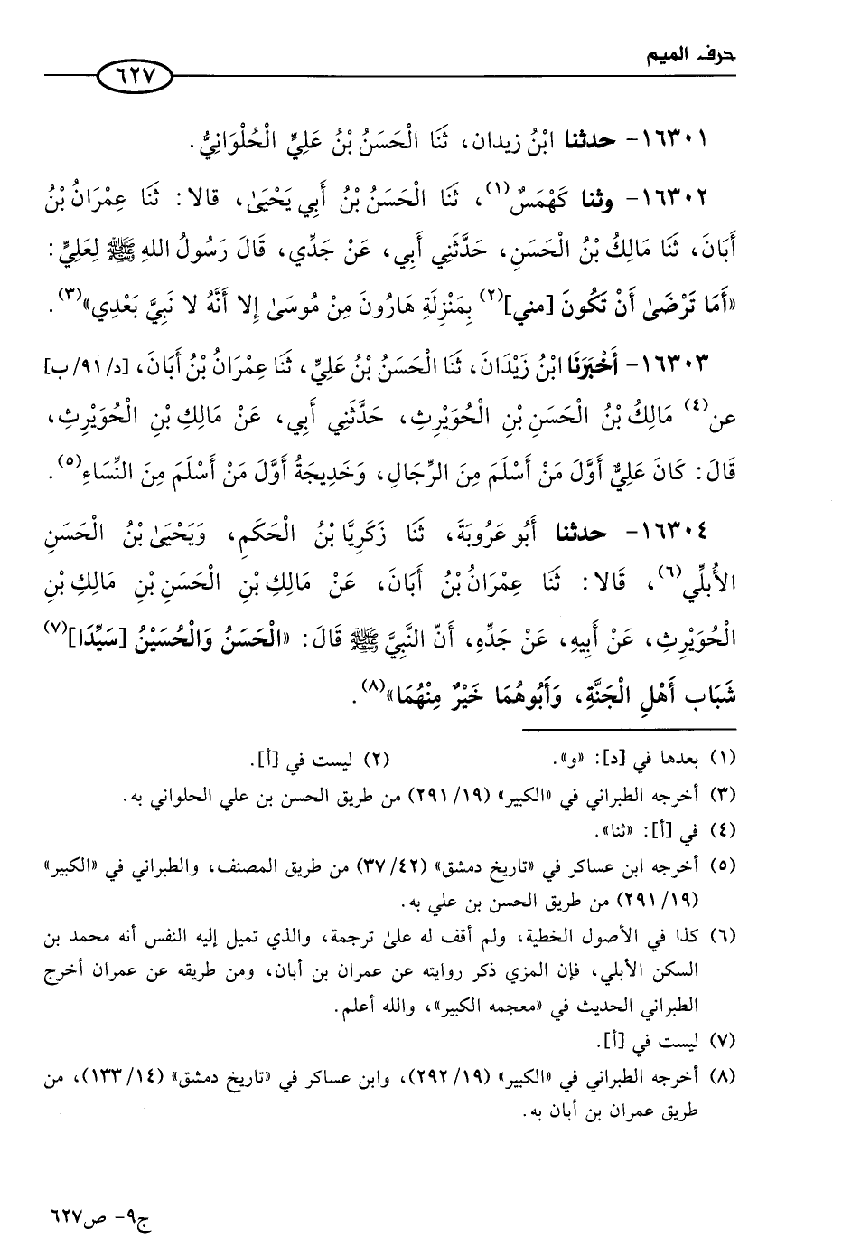 16304 - حَدثنا أَبو عَرُوبة، حَدثنا زكريا بن الحكم، ويحيى بن الحسن الأبلي، قالا: حَدثنا عمران بن أَبَان، عن مالك بن الحسن بن مالك بن الحويرث، عن أبيه، عن جَدِّهِ، أن النبي صَلى الله عَليه وسَلم قال: الحسن، والحُسَين سيدا شباب أهل الجنة، وأبوهما خير منهما.
