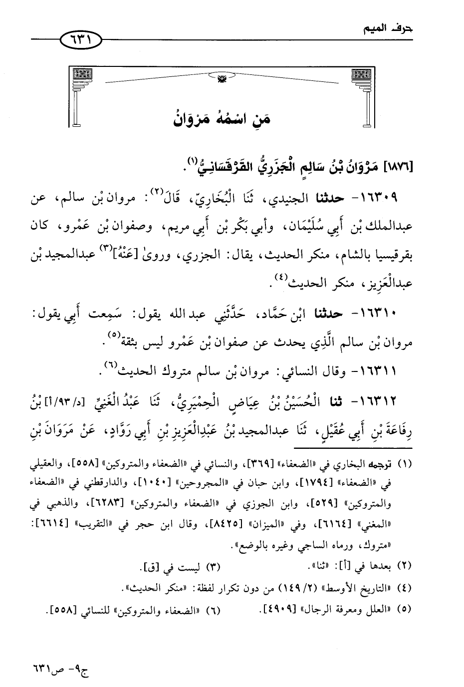 16309 - حَدثنا الجنيدي، حَدثنا البُخاري، قال: مروان بن سالم، عن عَبد الملك بن أبي سليمان، وأبي بكر بن أبي مريم، وصفوان بن عَمرو، كان بقرقيسيا بالشام، منكر الحديث، يُقال: الجزري، وروى عنه عَبد المجيد بن عَبد العزيز، منكر الحديث.