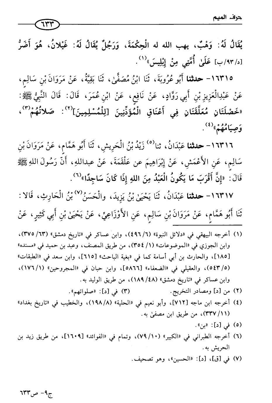 16316 - حَدثنا عبدان، حَدثنا زيد بن الحريش، حَدثنا أَبو همام، عن مروان بن سالم، عن الأَعمَش، عن إبراهيم، عن علقمة، عن عَبد الله؛ أن رسول الله صَلى الله عَليه وسَلم قال: إن أقرب ما يكون العبد من الله إذا كان ساجدا.