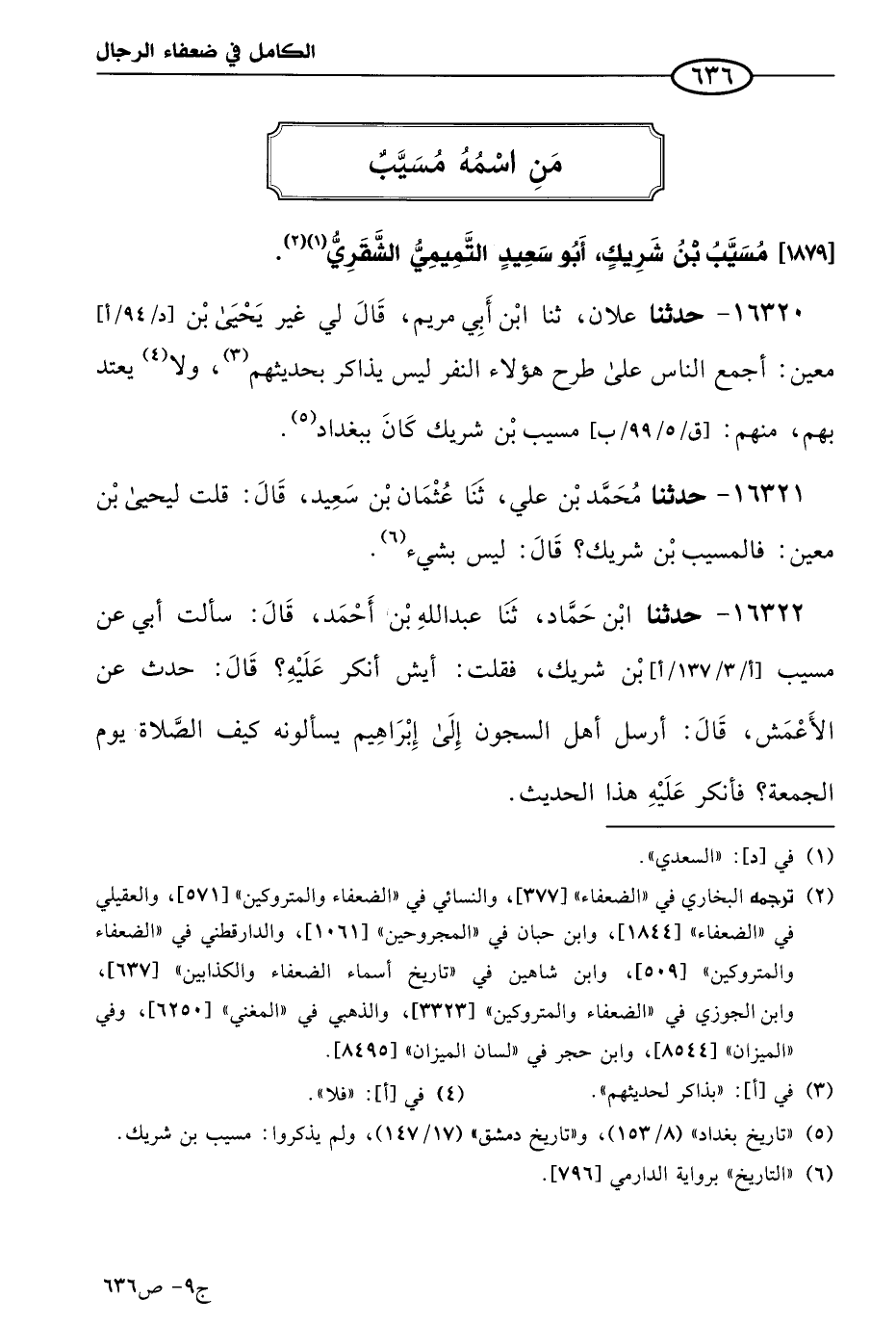 16320 - حَدثنا علان، حَدثنا ابن أبي مريم، قال لي غير يَحيى بن مَعين: أجمع الناس على طرح هؤلاء النفر، ليس يذاكر بحديثهم ولا يعتد بهم، منهم: مسيب بن شَريك كان ببغداد.