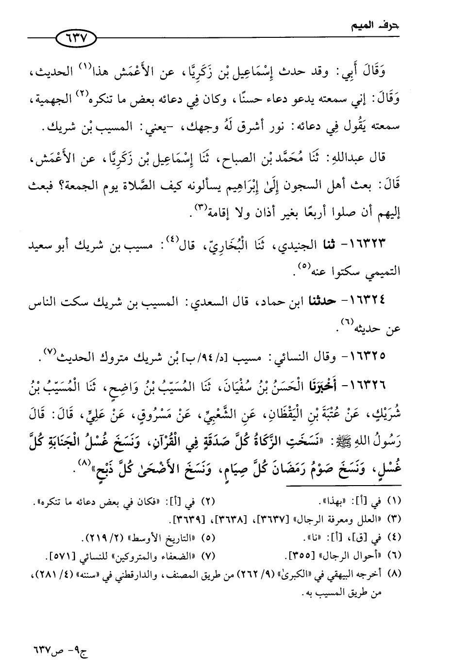 16323 - حَدثنا الجنيدي، حَدثنا البُخاري قال: مسيب بن شَريك، أَبو سعيد التميمي سكتوا عنه.