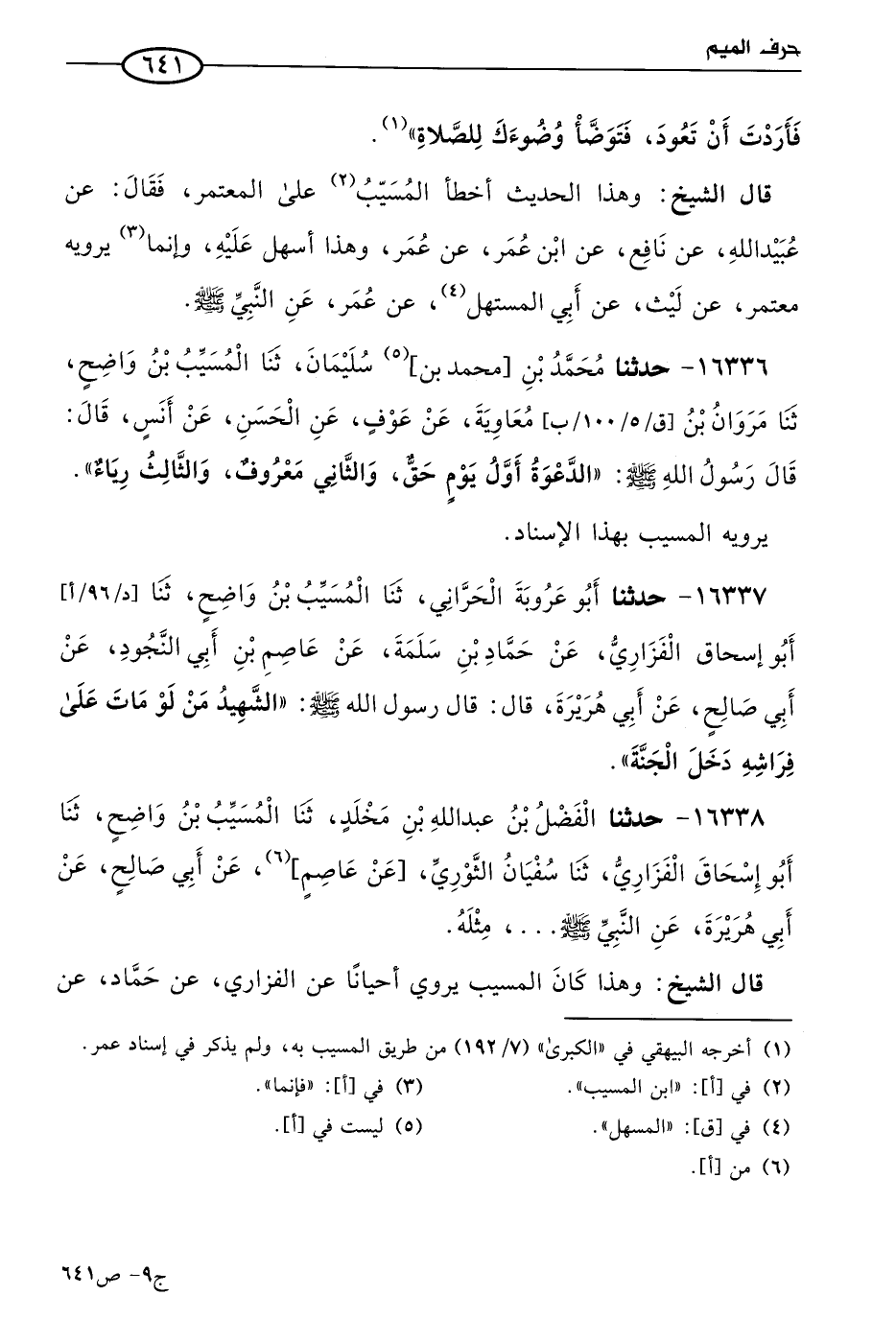 16337 - حَدثنا أَبو عَرُوبة الحراني، حَدثنا المُسَيَّب بن واضح، حَدثنا أَبو إسحاق الفزاري، عن حماد بن سلمة، عن عاصم بن أبي النجود، عن أبي صالح، عن أبي هريرة، قال: قال رسول الله صَلى الله عَليه وسَلم: الشهيد من لو مات على فراشه دخل الجنة.