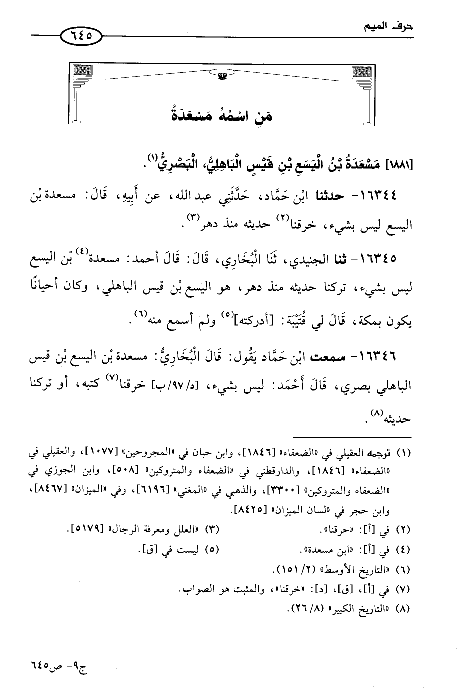 16346 - سمعتُ ابن حماد، يقول: قال البُخاري: مسعدة بن اليسع بن قيس الباهلي بصري، قال أحمد: ليس بشَيءٍ، خرقنا كتبه أو تركنا حديثه.