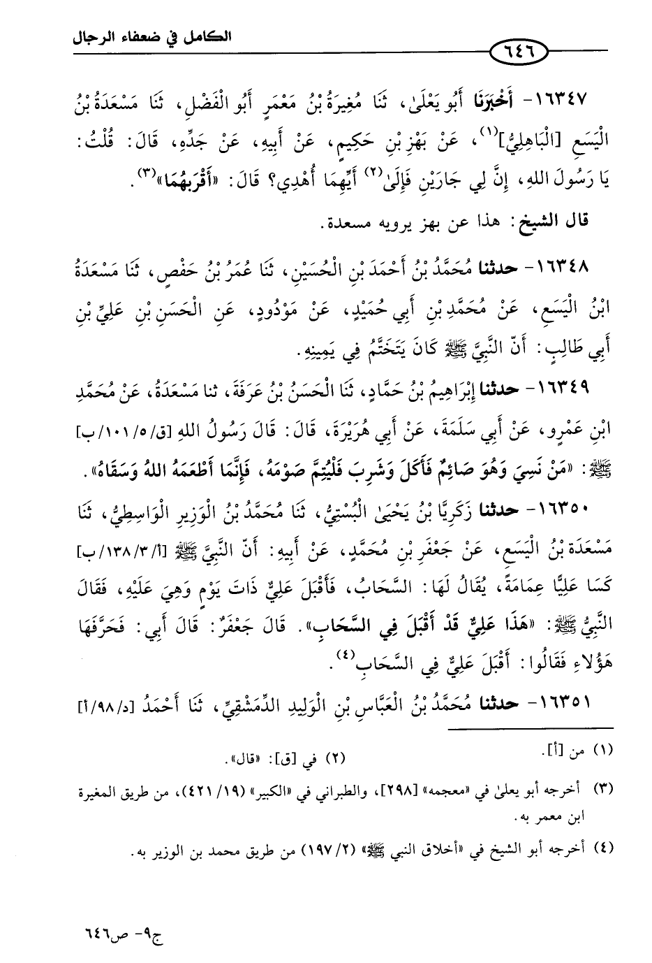 16350 - حَدثنا زكريا بن يَحيى البستي، حَدثنا مُحمد بن الوزير الواسطي، حَدثنا مسعدة بن اليسع، عن جعفر بن مُحمد، عن أبيه؛ أن النبي صَلى الله عَليه وسلم كسا عَليًا عمامة، يقال لها: السحاب، فاقبل علي ذات يوم وهي عليه، فقال النبي صَلى الله عَليه وسلم: هذا علي قد أقبل في السحاب. قال جعفر: قال أبي: فحرفها هؤلاء، فقالوا: أقبل علي في السحاب.