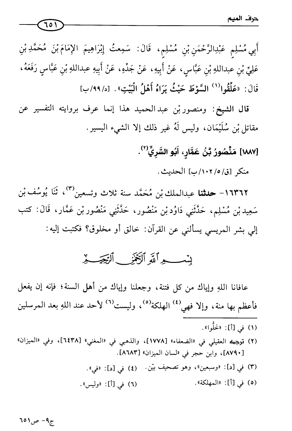16362 - حَدثنا عَبد الملك بن مُحمد، سنة ثلاث وتسعين، حَدثنا يوسف بن سعيد بن مسلم، حَدَّثني داود بن منصور، حَدَّثني منصور بن عمار، قال: كتب إلي بشر المريسي يسألني عن القرآن: خالق، أو مخلوق، فكتبت إليه: