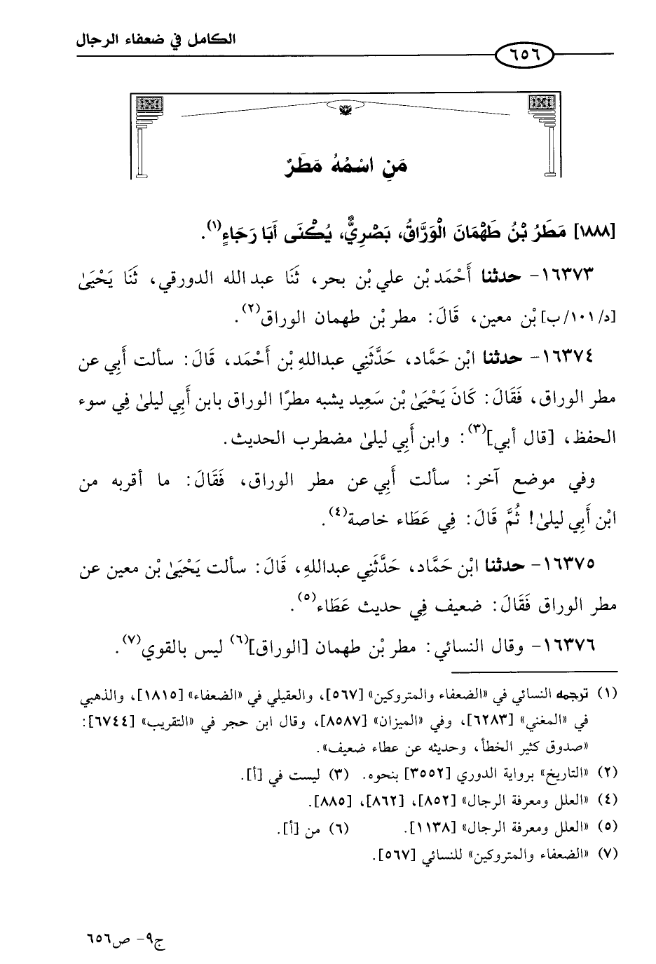 16373 - حَدثنا أحمد بن علي بن بحر، حَدثنا عَبد الله الدورقي، حَدثنا يَحيى بن مَعين، قال: مطر بن طهمان الوراق.