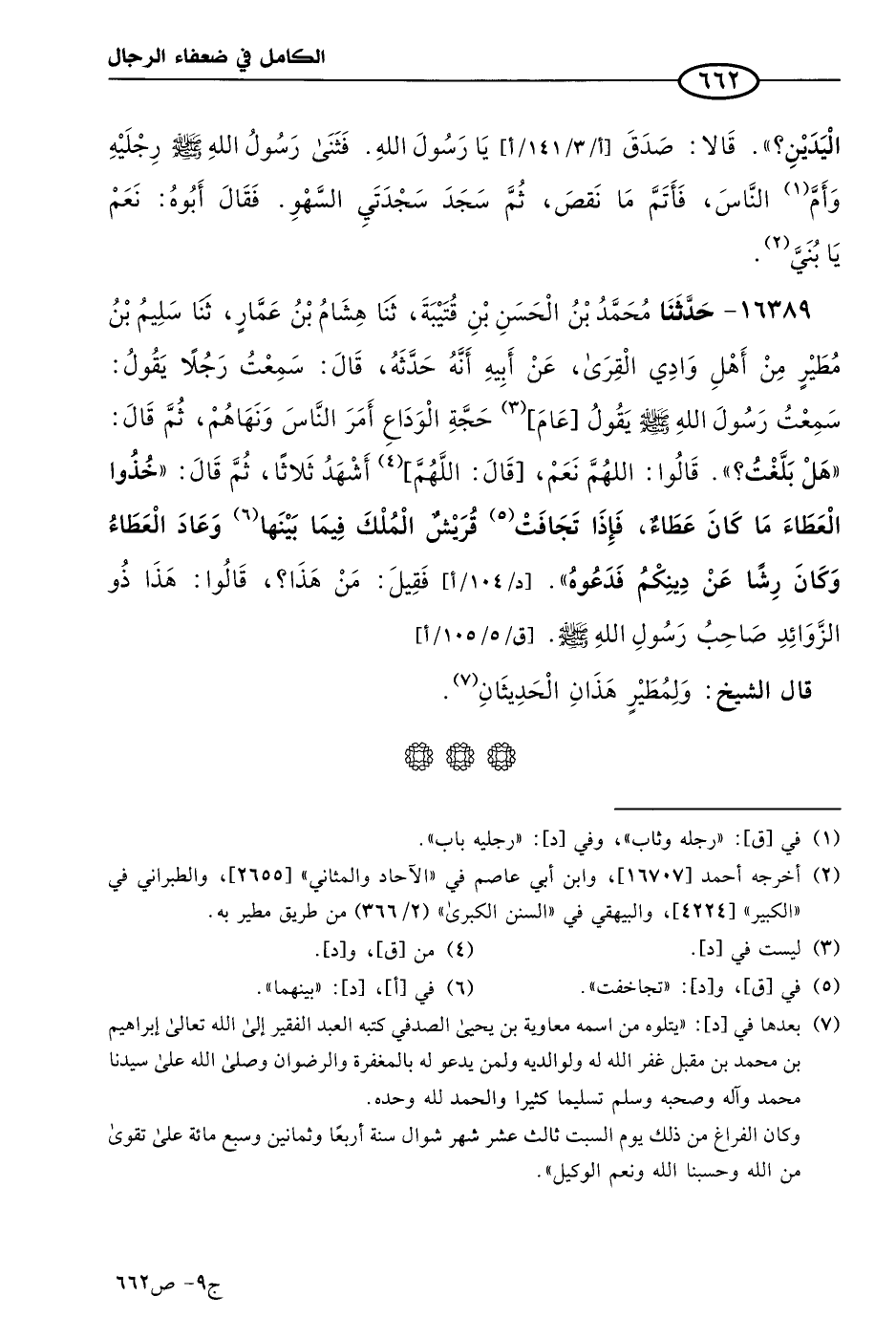 16389 - حَدثنا مُحمد بن الحسن بن قتيبة، حَدثنا هشام بن عمار، حَدثنا سليم بن مطير، من أهل وادي القِرَى، عن أبيه، أنه حدثه، قال: سمعتُ رجلاً، يقول: سَمعتُ رسول الله صَلى الله عَليه وسَلم يقول عام حجة الوداع، أمر الناس ونهاهم، ثم قال: هل بلغت؟ قالوا: اللهم نعم، قال: اللهم اشهد (1)، ثلاثا، ثم قال: خذوا العطاء، ما كان عطاء، فإذا تجافت قريش الملك فيما بينها وعاد العطاء، وكان رشا عن دينكم فدعوه، فقيل: من هذا؟ قالوا: هذا ذو الزوائد، صاحب رسول الله صَلى الله عَليه وسَلم.