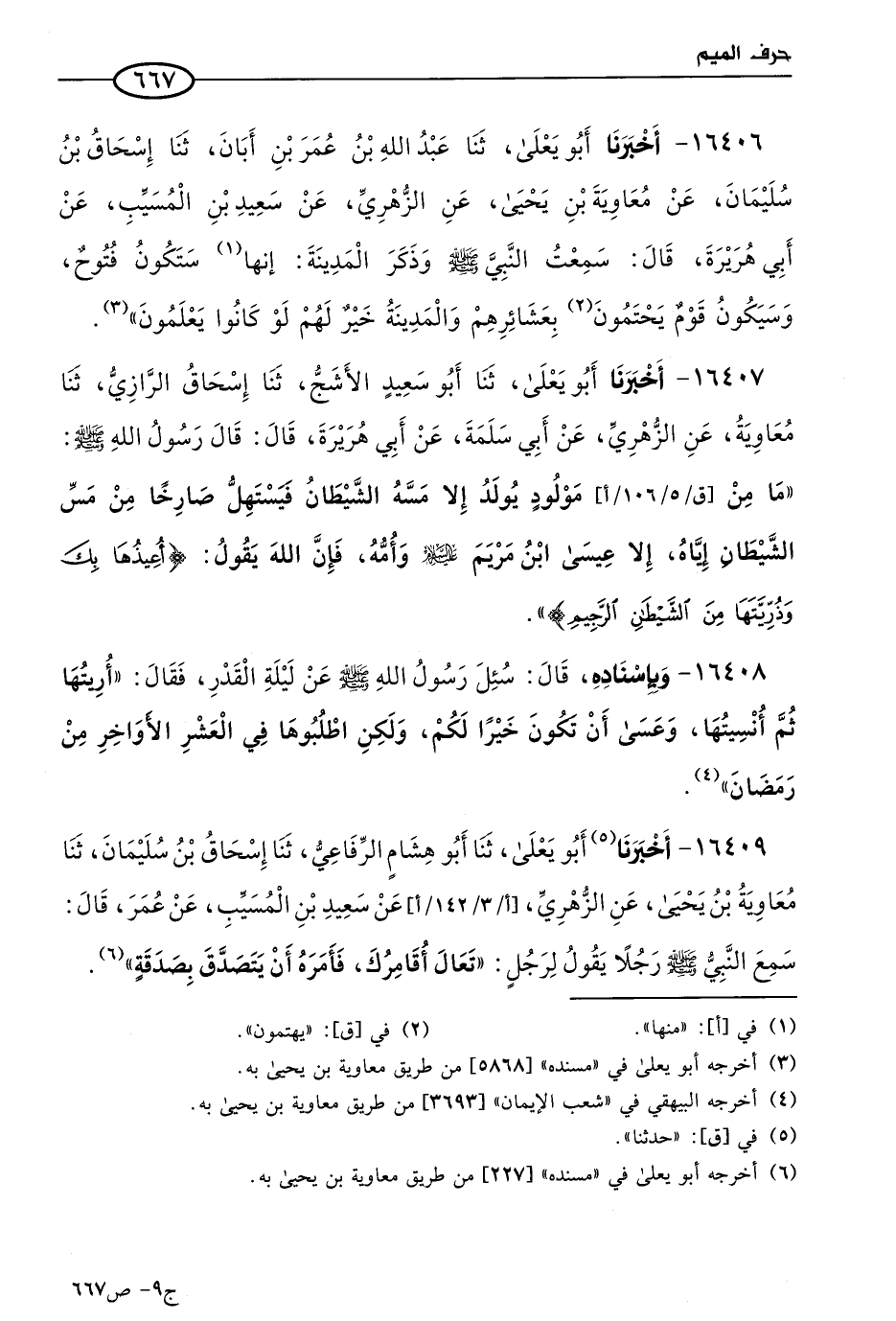 16406 - أخبرنا أَبو يَعلَى، حَدثنا عَبد الله بن عُمر بن أَبَان، حَدثنا إسحاق بن سليمان، عن معاوية بن يَحيى، عن الزُّهْري، عن سعيد بن المُسَيَّب، عن أبي هريرة، قال: سمعتُ النبي صَلى الله عَليه وسلم، وذكر المدينة: إنها ستكون فتوح، وسيكون قوم يحتمون بعشائرهم، والمدينة خير لهم لو كانوا يعلمون.