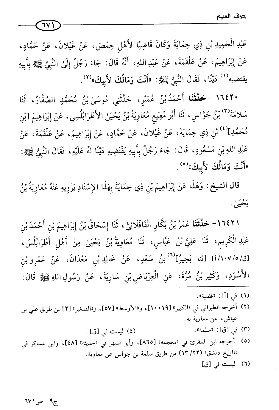 16420 - حَدثنا أحمد بن عُمَير، حَدَّثني موسى بن مُحمد الصفار، حَدثنا سلامة بن جواس، حَدثنا أَبو مطيع معاوية بن يَحيى الأطرابلسي، عن إبراهيم بن مُحمد بن ذي حماية، عن غيلان، عن حماد، عن إبراهيم، عن علقمة، عن عَبد الله بن مسعود قال: جَاء رجل بأبيه يقتضيه دينا له عليه، فقال النبي صَلى الله عَليه وسلم: أنت ومالك لأبيك.