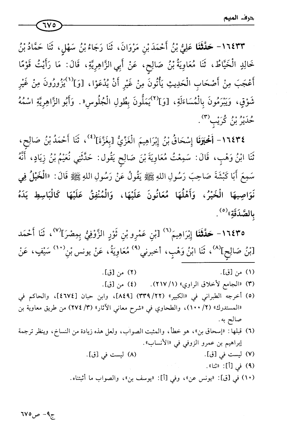 16434 - أخبرنا إسحاق بن إبراهيم الغزي بغزة، حَدثنا أحمد بن صالح، حَدثنا ابن وهب، قال: سمعتُ معاوية بن صالح، يقول: حَدَّثني نعيم بن زياد، أنه سمع أبا كبشة صاحب رسول الله صَلى الله عَليه وسَلم، يقول عن رسول الله صَلى الله عَليه وسَلم، قال: الخيل في نواصيها الخير، وأهلها معانون عليها، والمنفق عليها كالباسط يده بالصدقة.
