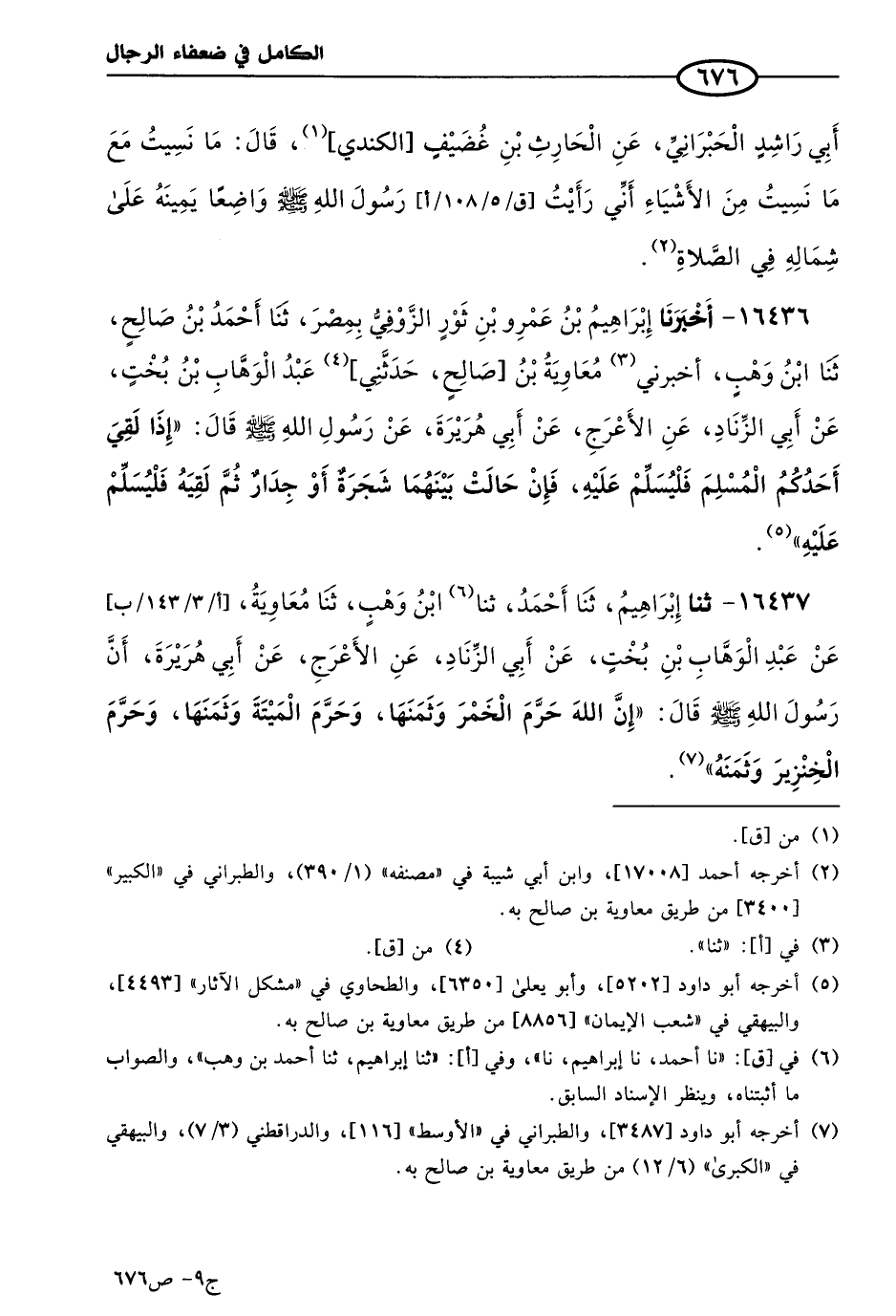 16436 - أخبرنا إبراهيم بن عَمرو بن ثور الزوفي بمصر، حَدثنا أحمد بن صالح، حَدثنا ابن وهب، أخبرني معاوية بن صالح، حَدثني عَبد الوهاب بن بخت، عن أبي الزناد، عن الأعرج، عن أبي هريرة، عن رسول الله صَلى الله عَليه وسَلم، قال: إذا لقي أحدكم المسلم فليسلم عليه، فإن حالت بينهما شجرة أو جدار ثم لقيه، فليسلم عليه.