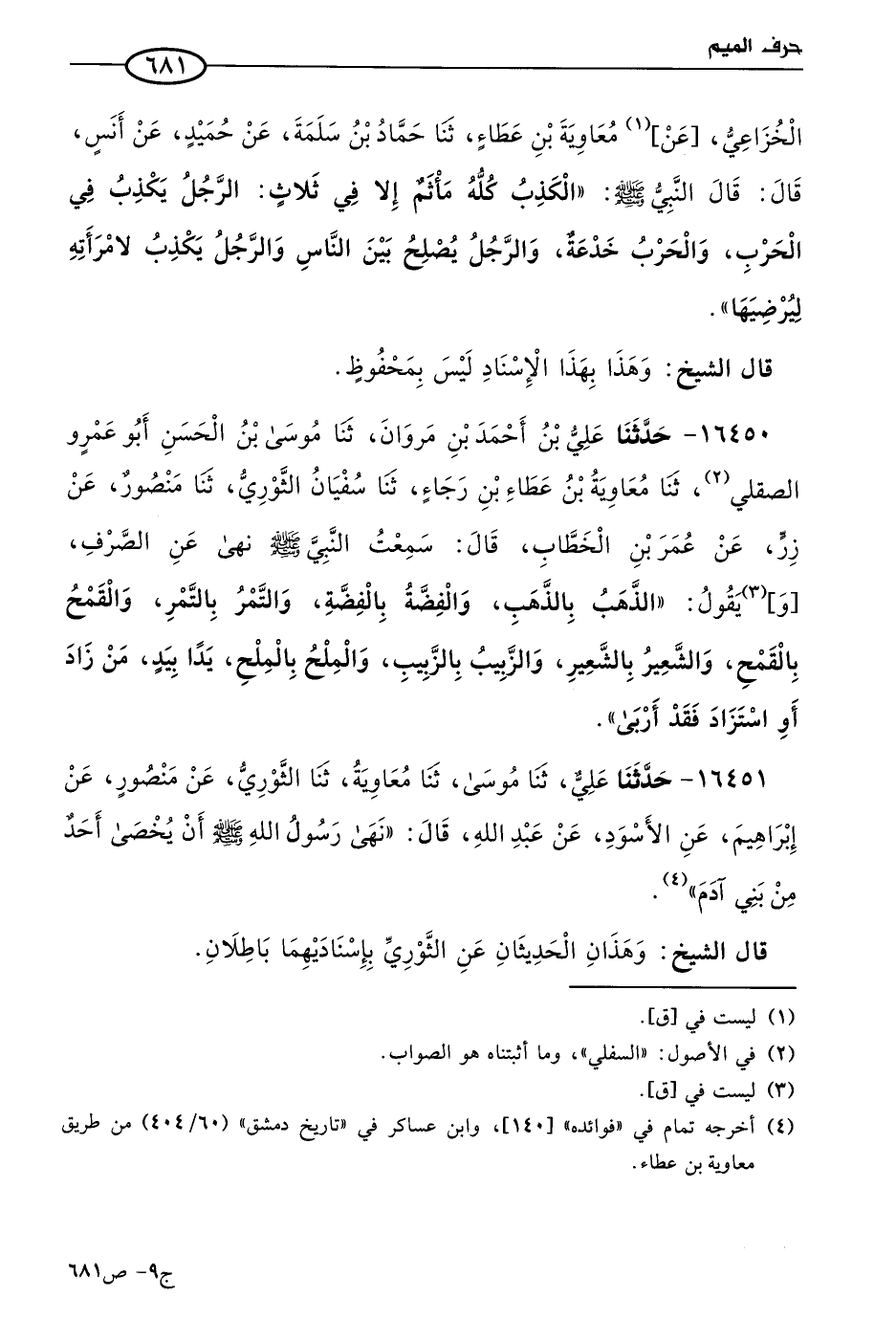 16450 - حَدثنا علي بن أحمد بن مروان، حَدثنا موسى بن الحسن أَبو عَمرو الصقلي، حَدثنا معاوية بن عطاء بن رجاء، حَدثنا سفيان الثَّوري، حَدثنا منصور، عن زر، عن عُمر بن الخطاب، قال: سمعتُ النبي صَلى الله عَليه وسلم نهى عن الصرف، ويقول: الذهب بالذهب، والفضة بالفضة، والتمر بالتمر، والقمح بالقمح، والشعير بالشعير، والزبيب بالزبيب، والملح بالملح، يدا بيد، من زاد أو استزاد، فقد أربى.