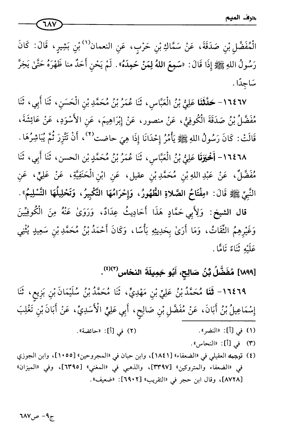 16469 - حَدثنا مُحمد بن علي بن مهدي، حَدثنا مُحمد بن سليمان بن بزيع، حَدثنا إسماعيل بن أَبَان، عن مفضل بن صالح أبي علي الأسدي، عن أَبَان بن تغلب بأحاديث، وقوله: أَبو علي الأسدي أظن مفضلا، يُكَنَّى: أبا علي، وأَبو جميلة لقبه.