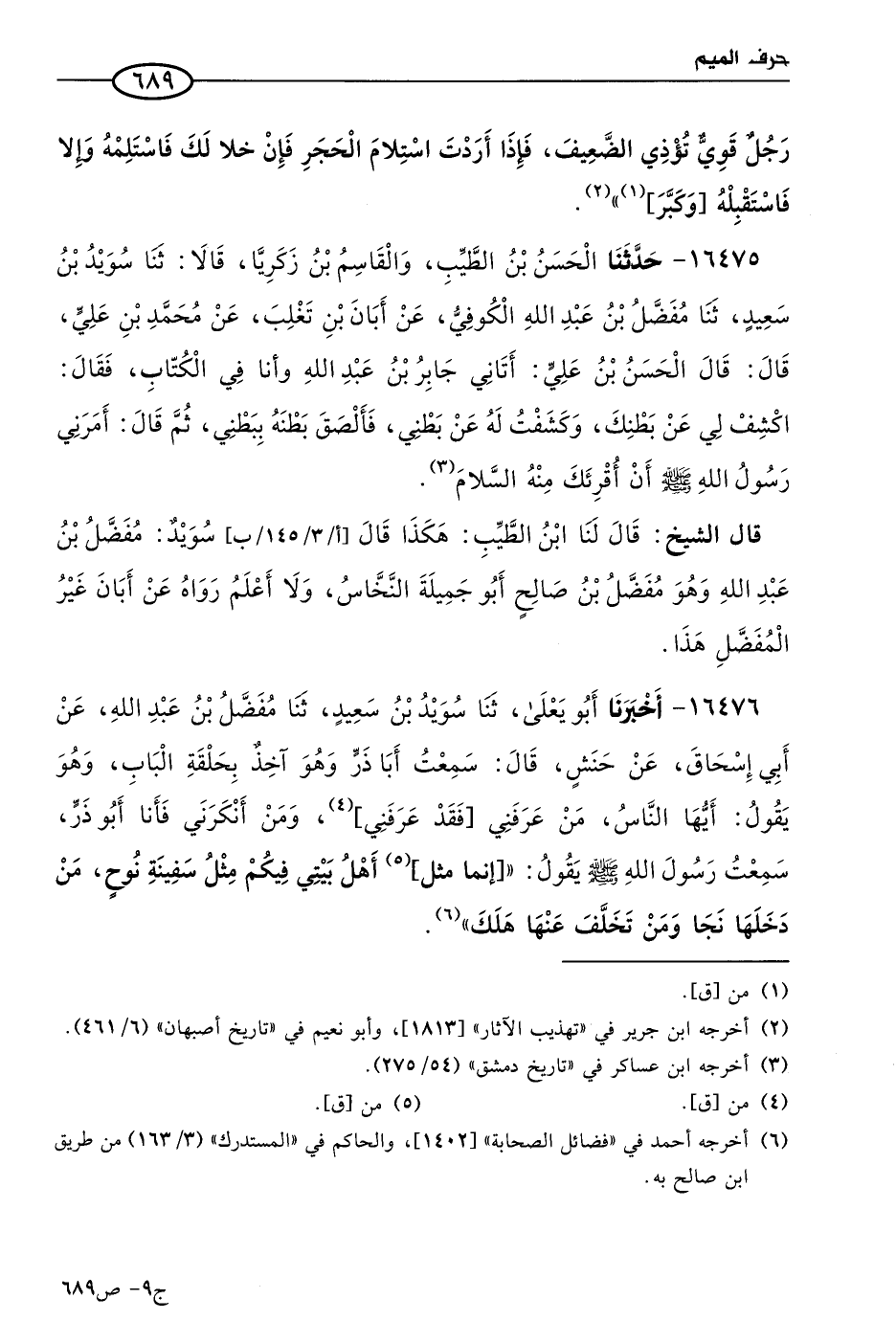 16476 - أخبرنا أَبو يَعلَى، حَدثنا سويد بن سعيد، حَدثنا مفضل بن عَبد الله، عن أبي إسحاق، عن حنش، قال: سمعتُ أبا ذر، وهو آخذ بحلقة الباب، وهو يقول: أيها الناس، من عرفني فقد عرفني، ومن أنكرني، فأنا أَبو ذر، سمعت رسول الله صَلى الله عَليه وسَلم يقول: إنما مثل أهل بيتي فيكم مثل سفينة نوح، من دخلها نجا، ومن تخلف عنها هلك.