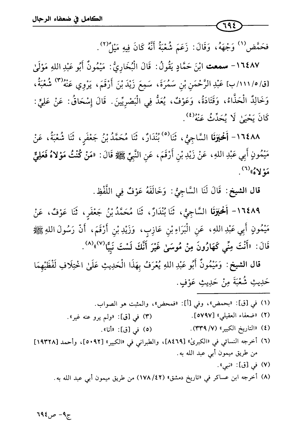 16488 - أخبرنا الساجي، حَدثنا بُنْدَار، حَدثنا مُحمد بن جعفر، حَدثنا شُعبَة، عن ميمون أبي عَبد الله، عن زيد بن أرقم، عن النبي صَلى الله عَليه وسَلم، قال: من كنت مولاه فعلى مولاه.
