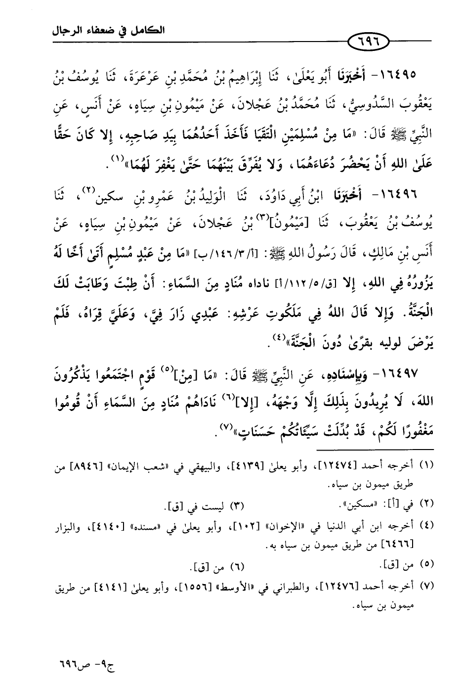 16495 - أخبرنا أَبو يَعلَى، حَدثنا إبراهيم بن مُحمد بن عرعرة، حَدثنا يوسف بن يعقوب السدوسي، حَدثنا مُحمد بن عجلان، عن ميمون بن سياه، عن أَنَس، عن النبي صَلى الله عَليه وسَلم، قال: ما من مسلمَين التقيا فأخذ أحدهما بيد صاحبه، إلا كان حقا على الله أن يحضر دعاءهما، ولا يفرق بينهما حتى يغفر لهما.