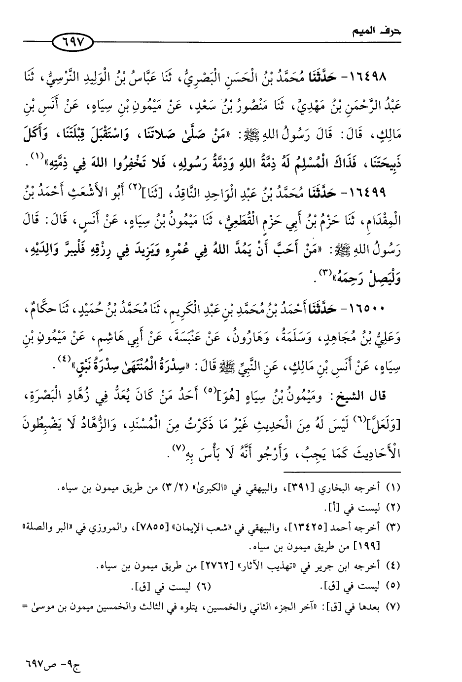 16498 - حَدثنا مُحمد بن الحسن البصري، حَدثنا عباس بن الوليد النرسي، حَدثنا عَبد الرحمن بن مهدي، حَدثنا منصور بن سعد، عن ميمون بن سياه، عن أَنَس بن مالك، قال: قال رسول الله صَلى الله عَليه وسَلم: من صلى صلاتنا، واستقبل قبلتنا، وأكل ذبيحتنا، فذاك المسلم، له ذمة الله وذمة رسوله، فلا تخفروا الله في ذمته.