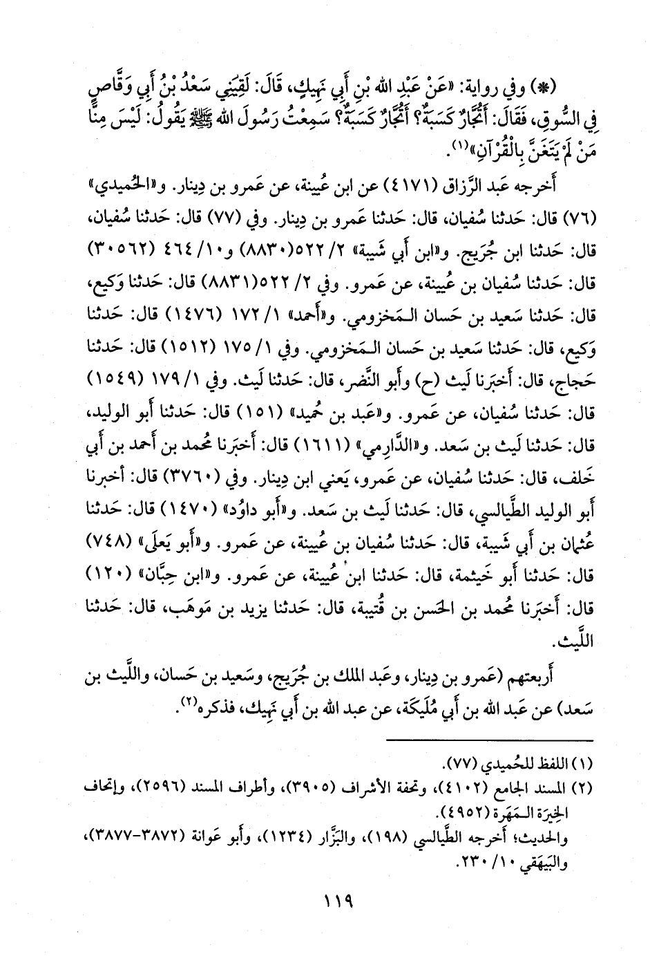 وفي (٣٧٦٠) قال: أخبرنا أَبو الوليد الطيالسي، قال: حدثنا ليث بن سعد. و «أَبو داود» (١٤٧٠) قال: حدثنا عثمان بن أبي شيبة، قال: حدثنا سفيان بن عُيينة، عن عَمرو. و «أَبو يَعلى» (٧٤٨) قال: حدثنا أَبو خيثمة، قال: حدثنا ابن عُيينة، عن عَمرو. و «ابن حِبَّان» (١٢٠) قال: أخبرنا محمد بن الحسن بن قتيبة، قال: حدثنا يزيد بن مَوهَب، قال: حدثنا الليث.