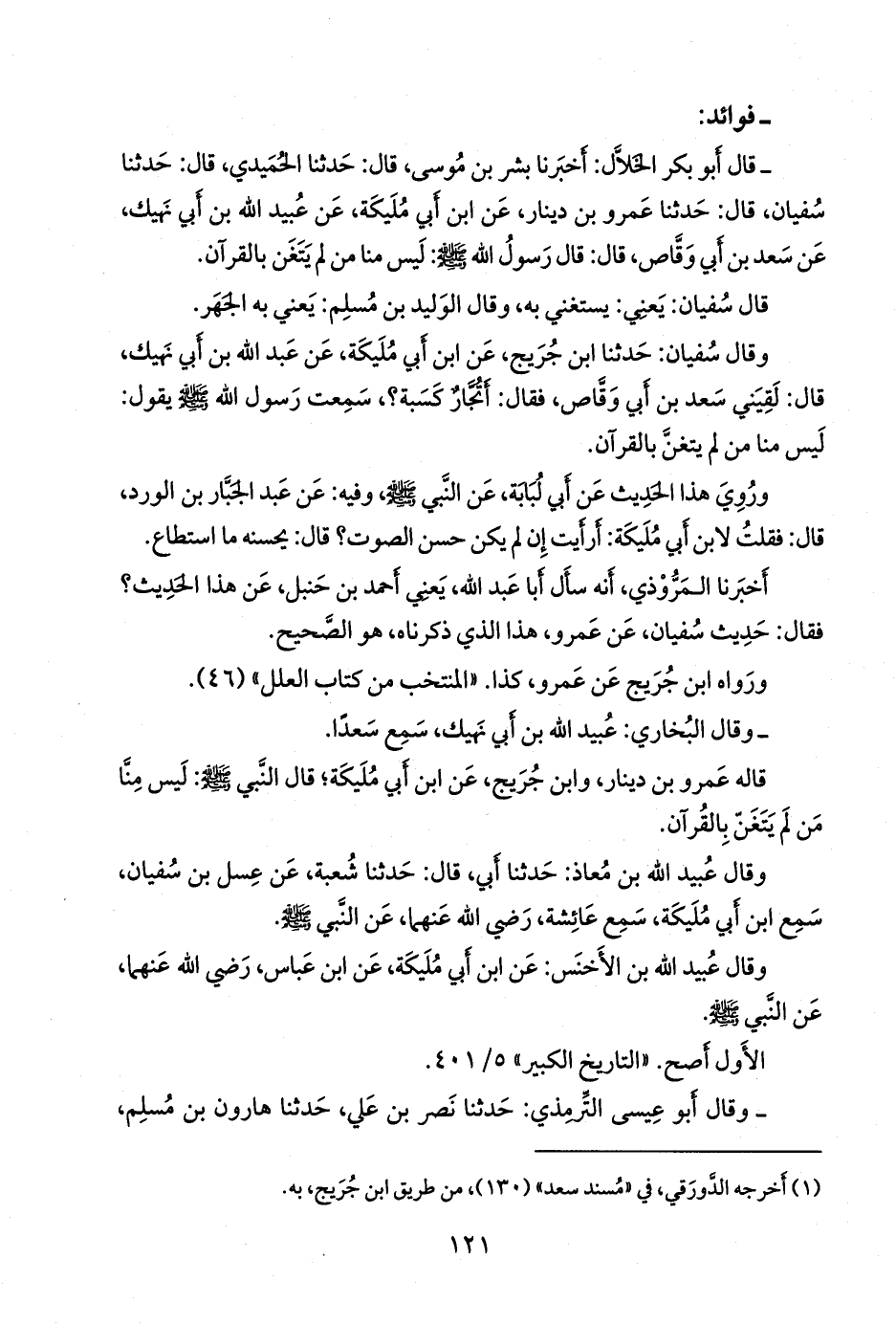 - قال أَبو بكر الخلال: أخبرنا بشر بن موسى، قال: حدثنا الحميدي، قال: حدثنا سفيان، قال: حدثنا عَمرو بن دينار، عن ابن أَبي مُليكة، عن عُبيد الله بن أَبي نَهيك، عن سعد بن أبي وقاص، قال: قال رسول الله صَلى الله عَليه وسَلم: ليس منا من لم يتغن بالقرآن.