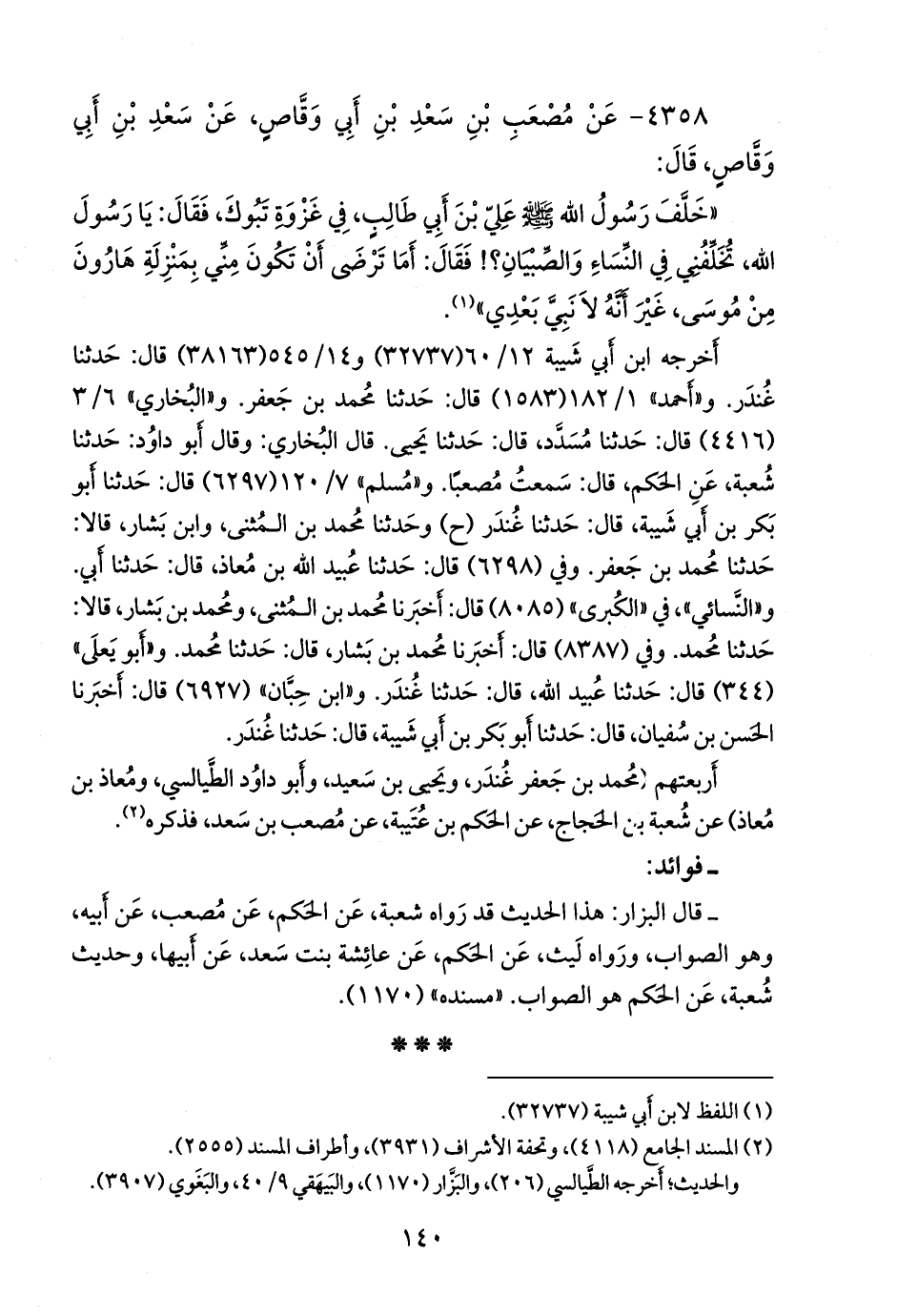 أربعتهم (محمد بن جعفر غُندَر، ويحيى بن سعيد، وأَبو داود الطيالسي، ومعاذ بن معاذ) عن شعبة بن الحجاج، عن الحكم بن عتيبة، عن مصعب بن سعد، فذكره (¬٢).
