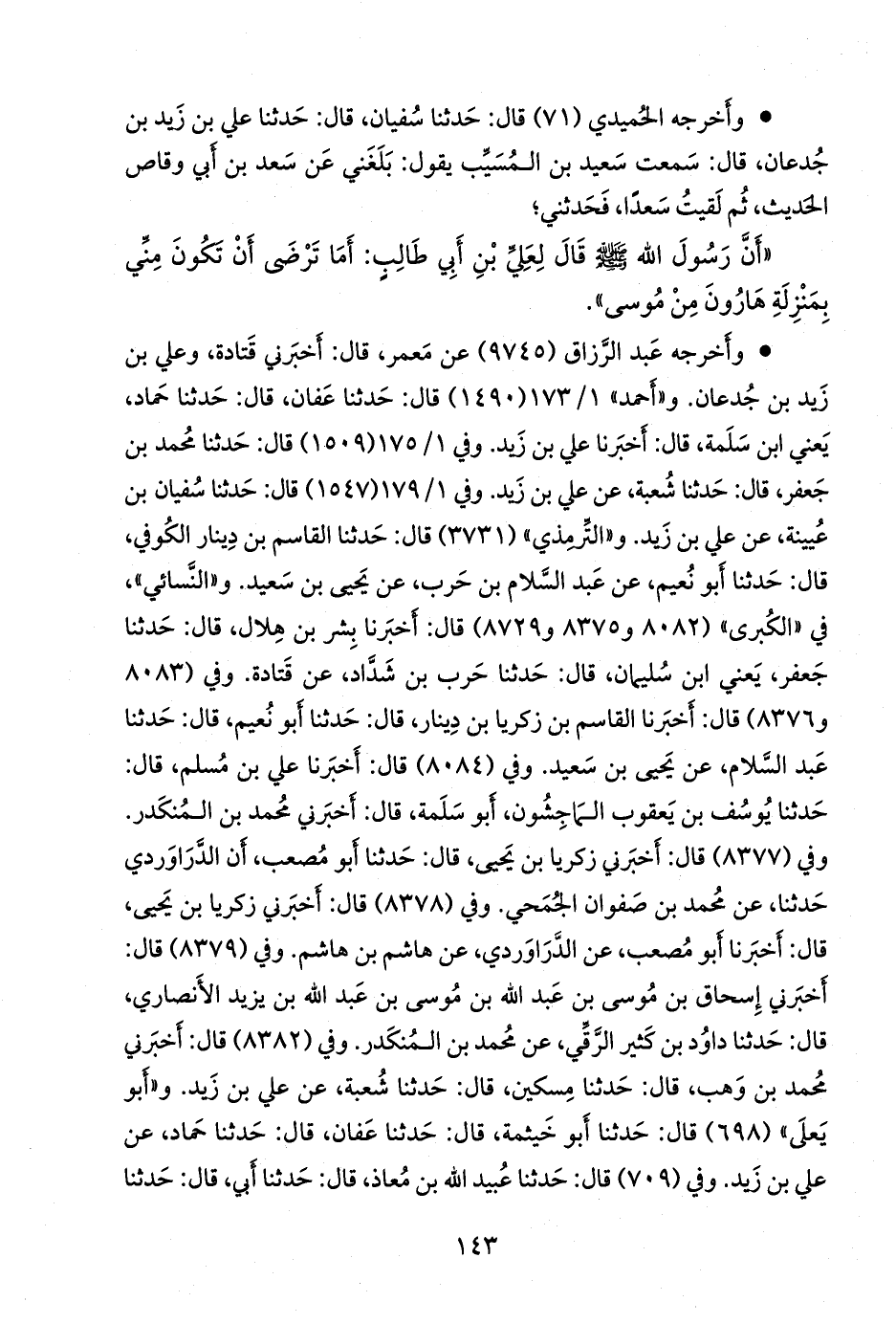 - وأخرجه عبد الرزاق (٩٧٤٥) عن مَعمَر، قال: أخبرني قتادة، وعلي بن زيد بن جدعان. و «أحمد» (١٤٩٠) قال: حدثنا عفان، قال: حدثنا حماد، يعني ابن سلمة، قال: أخبرنا علي بن زيد. وفي ١/ ١٧٥ (١٥٠٩) قال: حدثنا محمد بن جعفر، قال: حدثنا شعبة، عن علي بن زيد. وفي ١/ ١٧٩ (١٥٤٧) قال: حدثنا سفيان بن عُيينة، عن علي بن زيد. و «التِّرمِذي» (٣٧٣١) قال: حدثنا القاسم بن دينار الكوفي، قال: حدثنا أَبو نُعيم، عن عبد السلام بن حرب، عن يحيى بن سعيد. و «النَّسَائي» في «الكبرى» (٨٠٨٢ و ٨٣٧٥ و ٨٧٢٩) قال: أخبرنا بشر بن هلال، قال: حدثنا جعفر، يعني ابن سليمان، قال: حدثنا حرب بن شداد، عن قتادة. وفي (٨٠٨٣ و ٨٣٧٦) قال: أخبرنا القاسم بن زكريا بن دينار، قال: حدثنا أَبو نُعيم، قال: حدثنا عبد السلام، عن يحيى بن سعيد. وفي (٨٠٨٤) قال: أخبرنا علي بن مسلم، قال: حدثنا يوسف بن يعقوب المَاجِشون، أَبو سلمة، قال: أخبرني محمد بن المُنكدِر. وفي (٨٣٧٧) قال: أخبرني زكريا بن يحيى، قال: حدثنا أَبو مصعب، أن الدراوَرْدي حدثنا، عن محمد بن صفوان الجُمحي. وفي (٨٣٧٨) قال: أخبرني زكريا بن يحيى، قال: أخبرنا أَبو مصعب, عن الدراوَرْدي, عن هاشم بن هاشم. وفي (٨٣٧٩) قال: أخبرني إسحاق بن موسى بن عبد الله بن موسى بن عبد الله بن يزيد الأَنصاري، قال: حدثنا داود بن كثير الرَّقِّي، عن محمد بن المُنكدِر. وفي (٨٣٨٢) قال: أخبرني محمد بن وهب، قال: حدثنا مسكين، قال: حدثنا شعبة، عن علي بن زيد. و «أَبو يَعلى» (٦٩٨) قال: حدثنا أَبو خيثمة، قال: حدثنا عفان، قال: حدثنا حماد، عن علي بن زيد. وفي (٧٠٩) قال: حدثنا عُبيد الله بن معاذ، قال: حدثنا أبي، قال: حدثنا