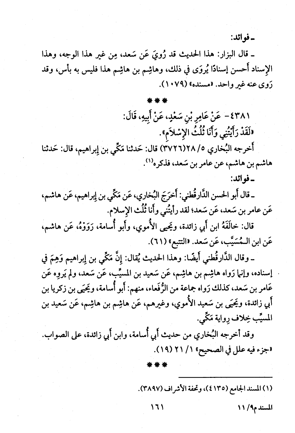 - قال أَبو الحسن الدارقُطني: أخرج البخاري، عن مكي بن إبراهيم، عن هاشم، عن عامر بن سعد، عن سعد؛ لقد رأيتني وأنا ثلث الإسلام.