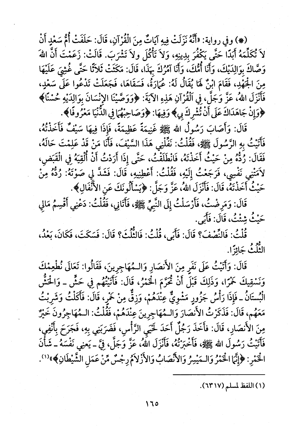 - وفي رواية: «عن مصعب بن سعد، عن أبيه، قال: أخذ أبي من الخمس سيفا، فأتى به النبي صَلى الله عَليه وسَلم فقال: هب لي هذا، فأبى، فأنزل الله، عز وجل: {يسألونك عن الأنفال قل الأنفال لله والرسول} (¬٢).