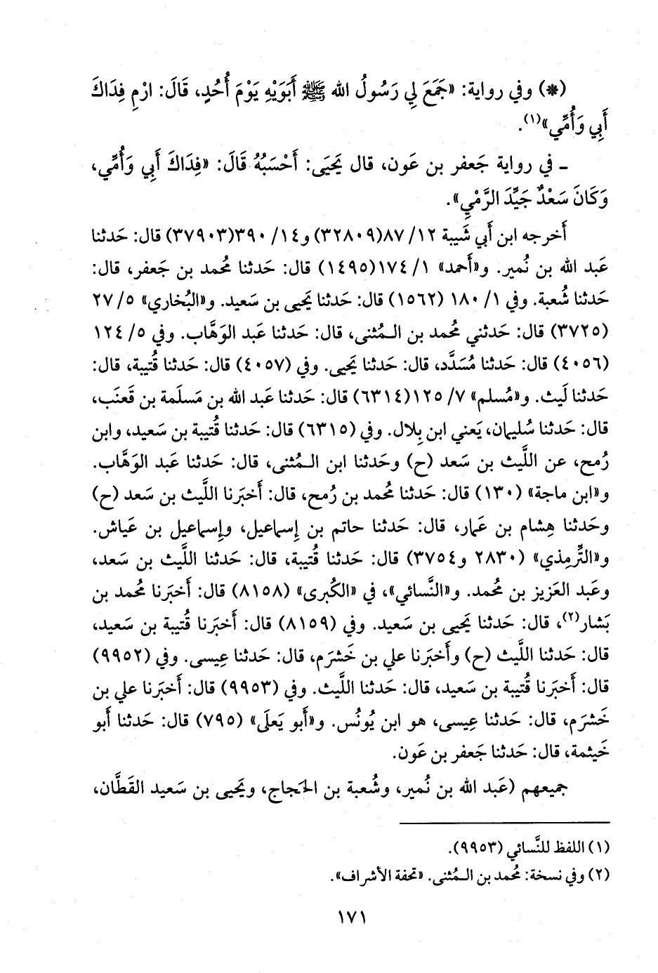 وفي (٦٣١٥) قال: حدثنا قتيبة بن سعيد، وابن رمح، عن الليث بن سعد (ح) وحدثنا ابن المثنى، قال: حدثنا عبد الوَهَّاب. و «ابن ماجة» (١٣٠) قال: حدثنا محمد بن رُمح، قال: أخبرنا الليث بن سعد (ح) وحدثنا هشام بن عمار، قال: حدثنا حاتم بن إسماعيل, وإسماعيل بن عياش. و «التِّرمِذي» (٢٨٣٠ و ٣٧٥٤) قال: حدثنا قتيبة، قال: حدثنا الليث بن سعد، وعبد العزيز بن محمد. و «النَّسَائي» في «الكبرى» (٨١٥٨) قال: أخبرنا محمد بن بشار (¬١)، قال: حدثنا يحيى بن سعيد. وفي (٨١٥٩) قال: أخبرنا قتيبة بن سعيد, قال: حدثنا الليث (ح) وأخبرنا علي بن خَشرَم, قال: حدثنا عيسى. وفي (٩٩٥٢) قال: أخبرنا قتيبة بن سعيد, قال: حدثنا الليث. وفي (٩٩٥٣) قال: أخبرنا علي بن خَشرَم, قال: حدثنا عيسى، هو ابن يونس. و «أَبو يَعلى» (٧٩٥) قال: حدثنا أَبو خيثمة، قال: حدثنا جعفر بن عون.