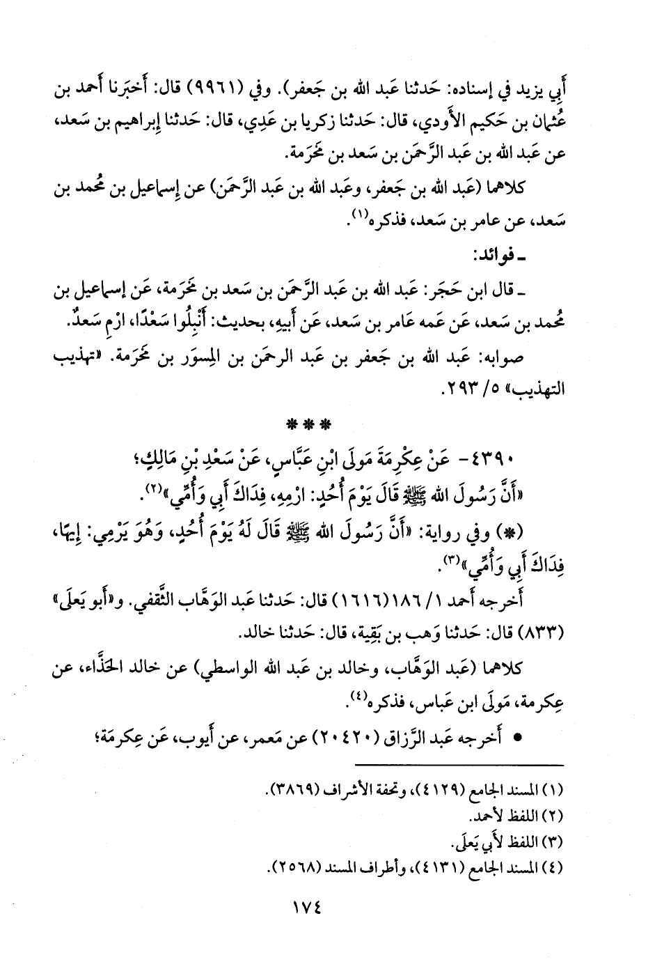 - قال ابن حجر: عبد الله بن عبد الرَّحمَن بن سعد بن مخرمة، عن إسماعيل بن محمد بن سعد، عن عمه عامر بن سعد، عن أبيه، بحديث: أنبلوا سعدا، ارم سعد.